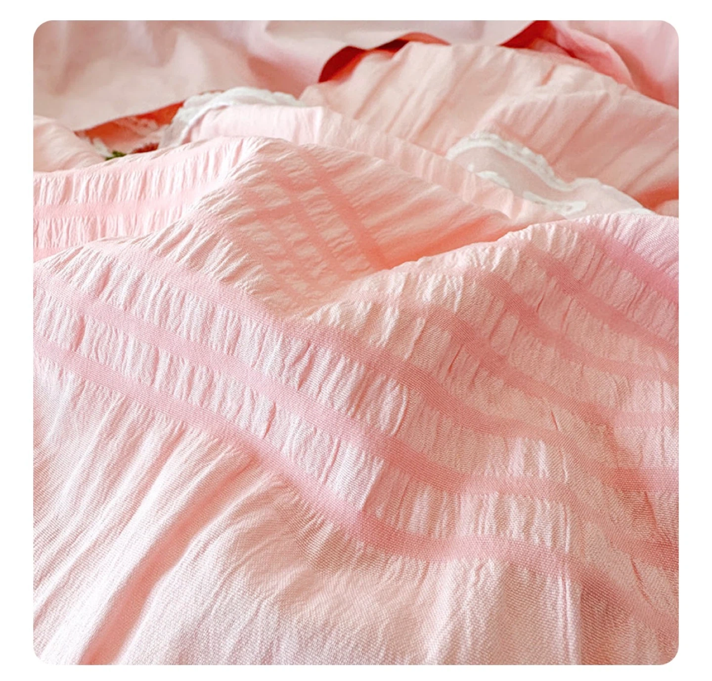 Here's a lovely pink bedding set, perfect for adding a touch of charm to your bedroom! The set features a delicate floral design and a ruffled edge. It looks like it would fit a queen size bed. It's in great condition and ready to bring some coziness to your home