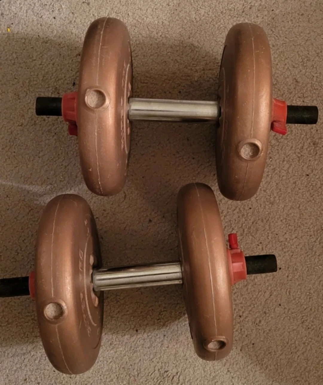 Selling a pair of adjustable dumbbells. They currently hold two 10-lb plates each. They're in good condition and ready for your home gym!
