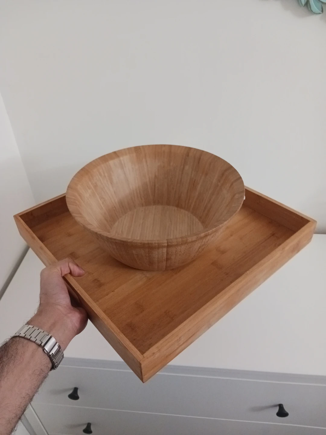 Wooden serving bowl paired with a matching bamboo tray. Clean, simple design. Tray includes cut-out handles on both sides for easy carrying. Can be used for serving, display, or home décor.