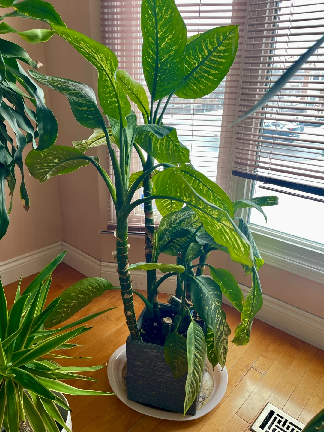 Healthy large green plant with multiple stems and large leaves in pot.