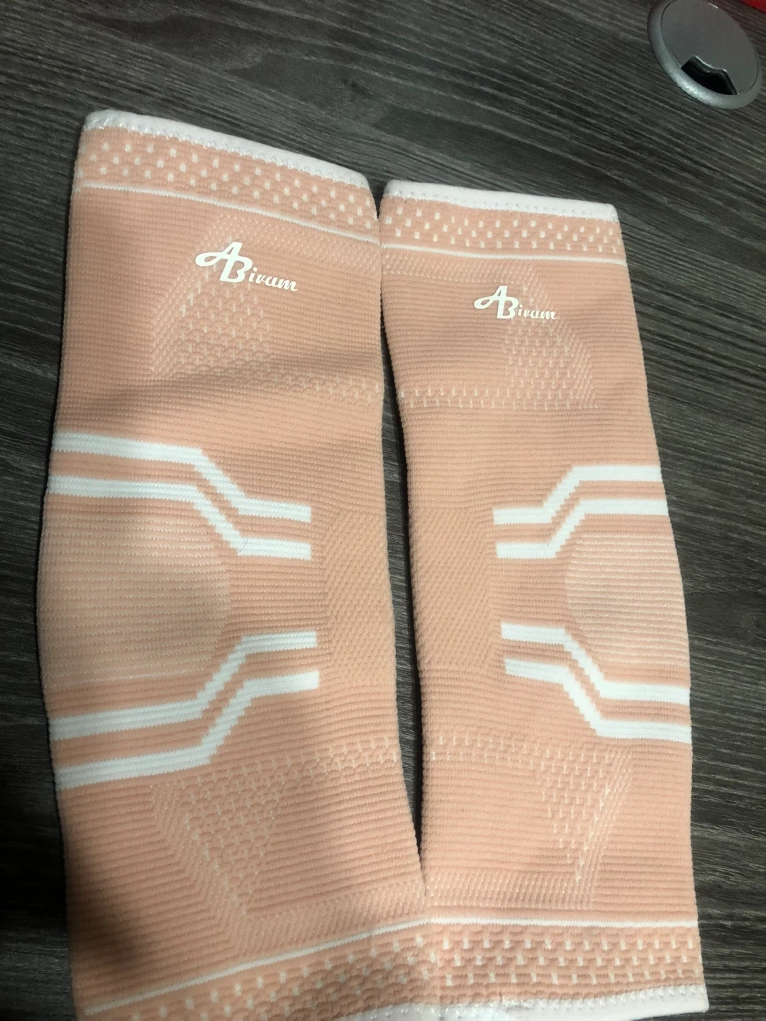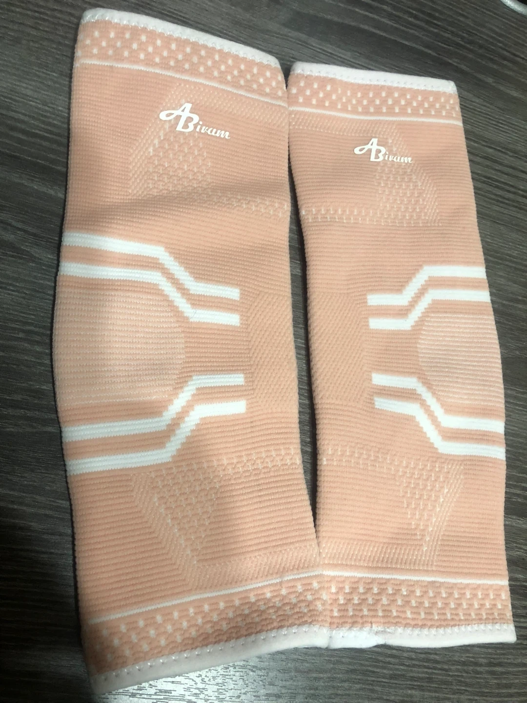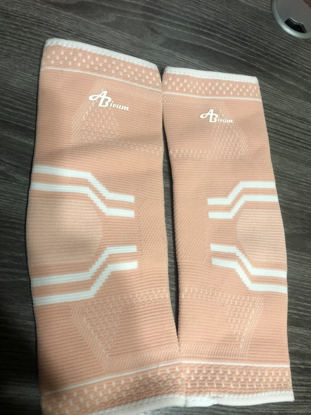 Selling a pair of ABivam knee brace support sleeves. They are a light peach colour with white accents. Great for providing support during activities!