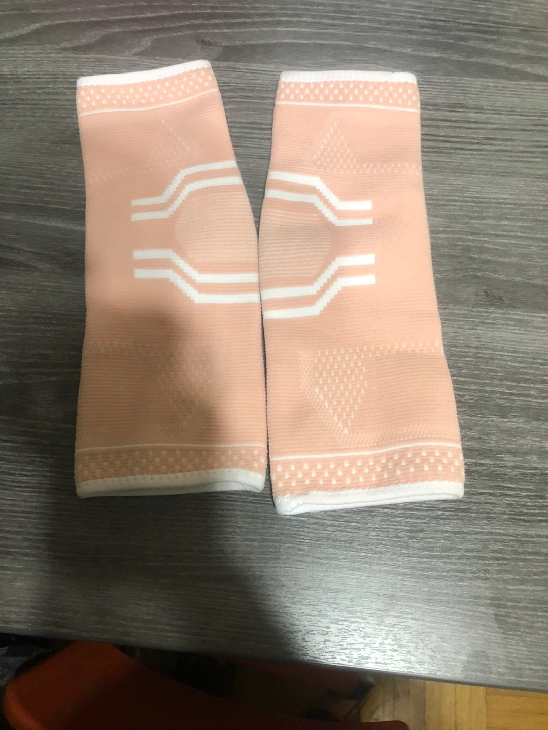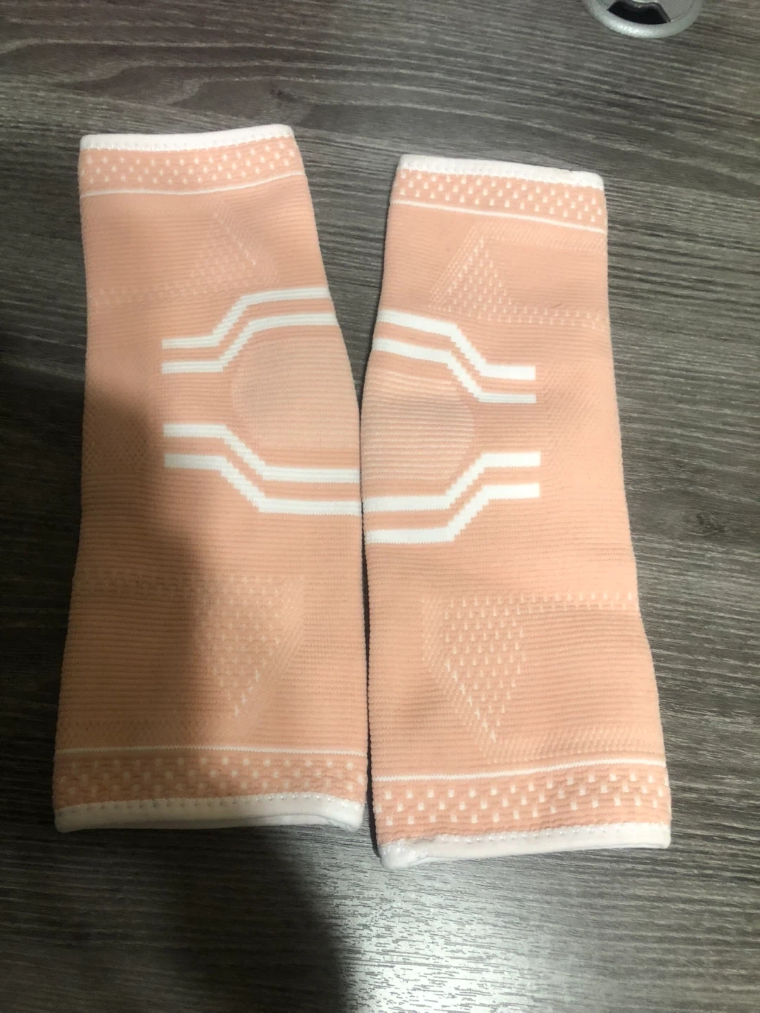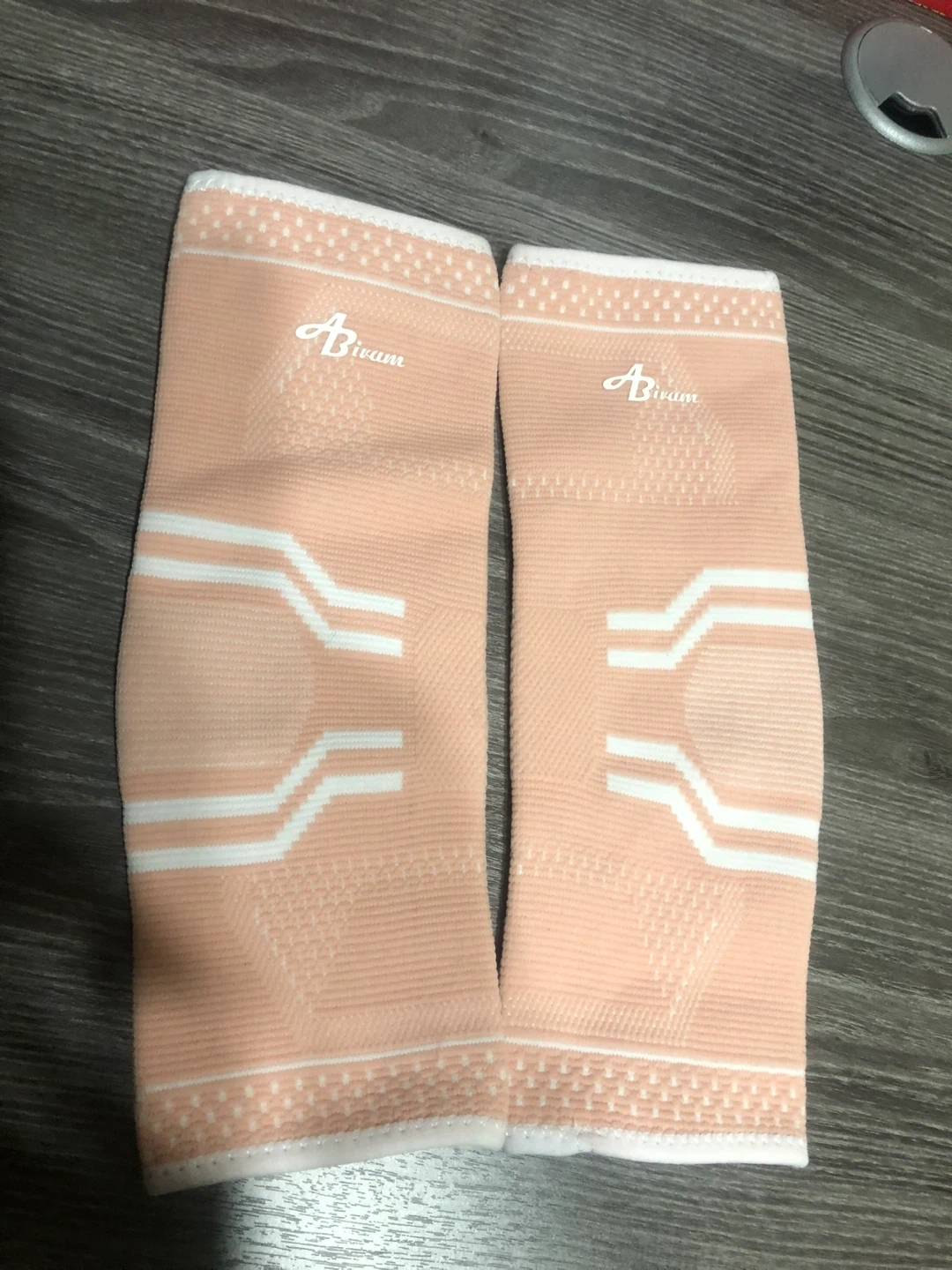Selling a pair of ABivam knee brace support sleeves. They are a light peach colour with white accents. Great for providing support during activities!