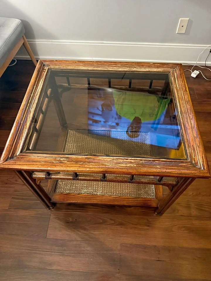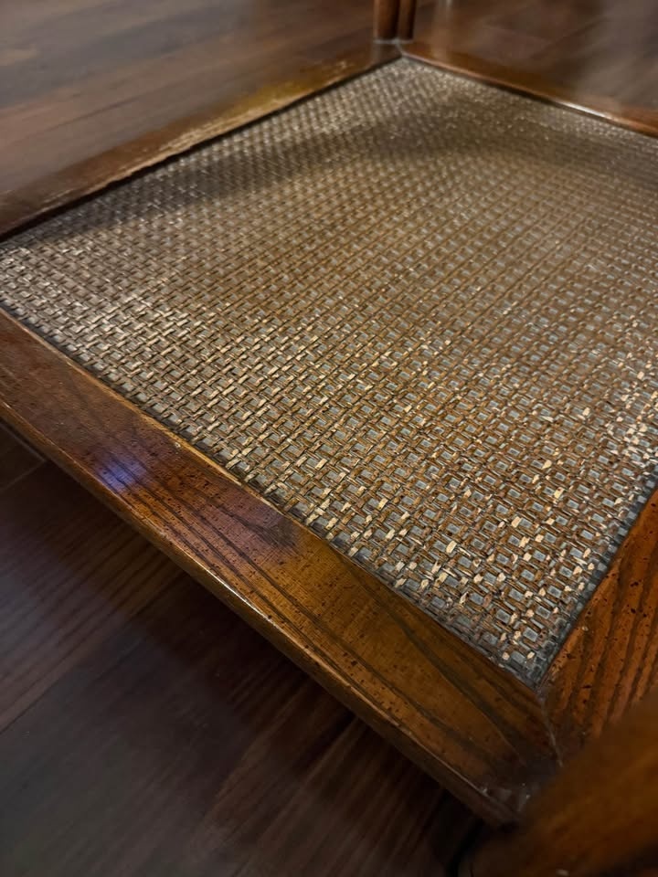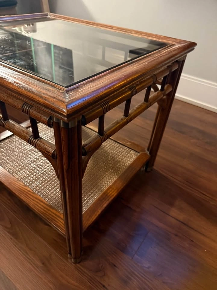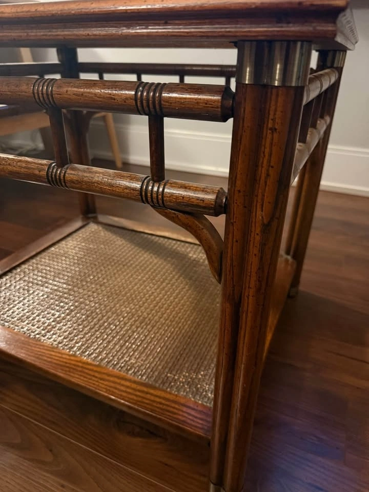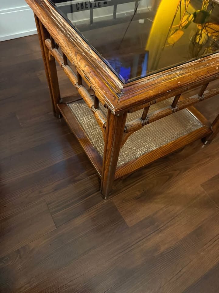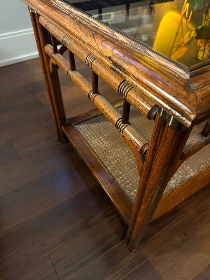 Beautiful sturdy well built rattan table in excellent condition. Darker wood colour.
