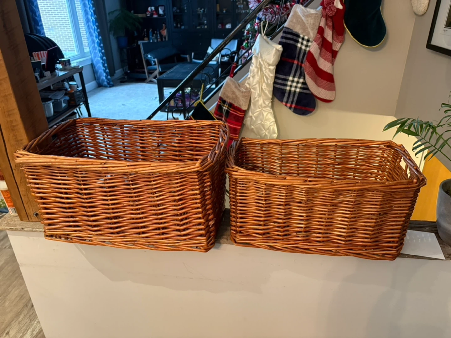Selling two wicker storage baskets. They're a warm brown colour and in good condition. Great for organizing your home!