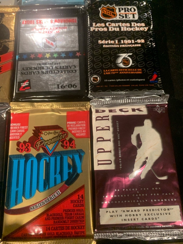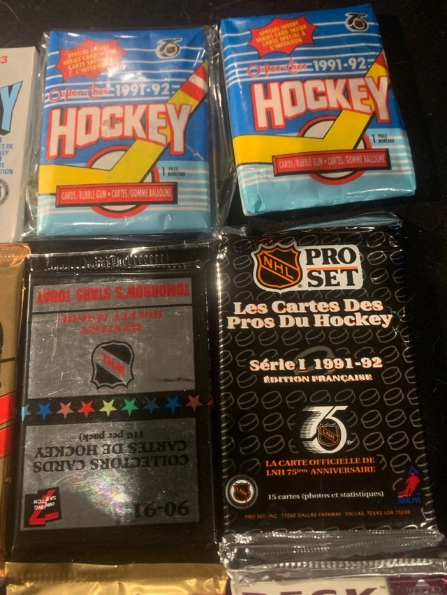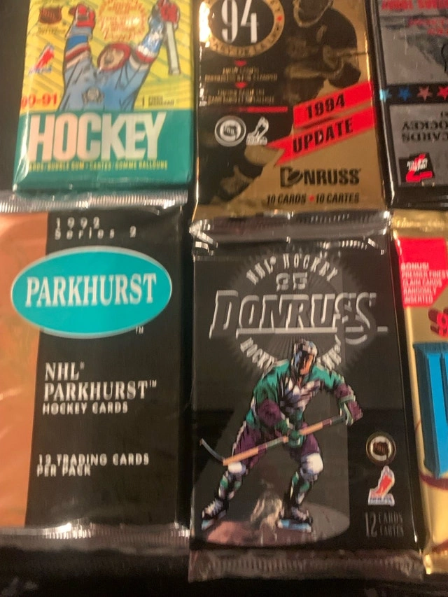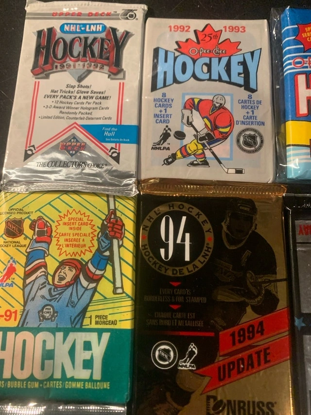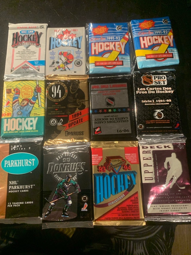 Dive into a piece of hockey history with these brand new unopened hockey wax packs, a treasure trove for collectors! This collection features 12 packs from various years and series, offering a chance to uncover rare and valuable cards. Given their pristine, unopened condition, these packs are highly sought after by enthusiasts looking to add to their collections. Get ready to experience the thrill of the chase as you peel back the wrapper and reveal what hidden gems await inside. These packs are like a time capsule, preserving the excitement of the game from years past. Each pack could hold the key to completing your favourite set or discovering a star player's rookie card. If the ad is up, the packs are ready to go to a new home!