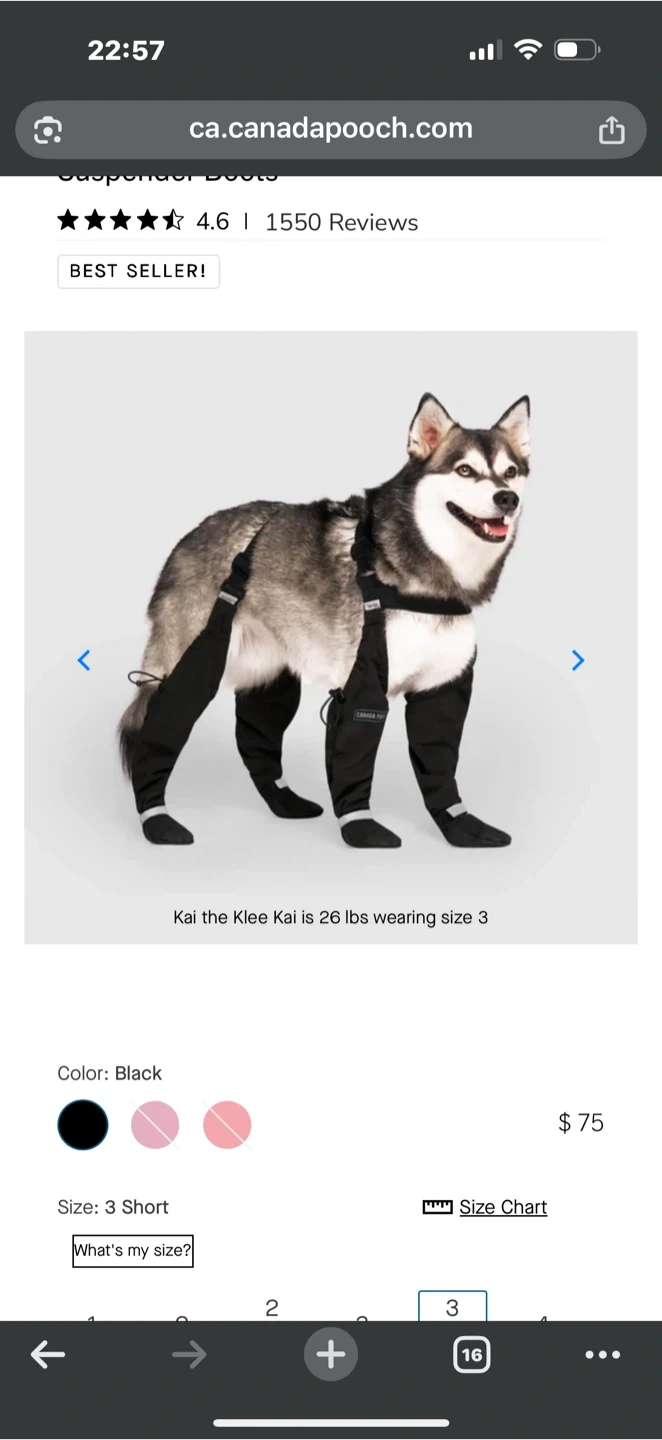 Selling a set of Canada Pooch suspender boots for dogs in size 3 short! They're black and come with their original carrying case. These boots are designed to stay on, even during active play. They are a best seller!