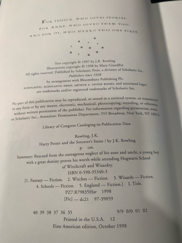 Own a piece of literary history with this used copy of Harry Potter and the Sorcerer's Stone, a first American edition printed in October 1998! This book has been well-loved, as you can see from the photos, showing its delightful journey through time. The cover has some wear but the story inside is still magical! While pricing first editions can be tricky, similar copies have been spotted around Kijiji for between $100 to $700, but condition is everything! Given the excellent condition, and the confusion about the errors, I'm only asking $100. I have 3 hard covers. If this ad is still floating around like a lost Hogwarts letter, then yes, it's still available!