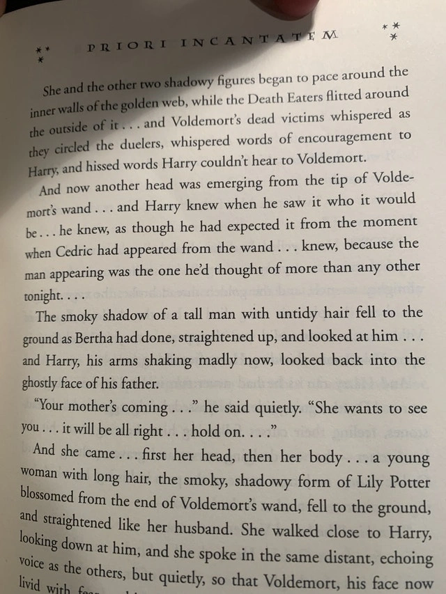 - Page 667 Error: In the “Priori Incantatem” scene, the order of the ghosts is switched, with James Potter appearing before Lily Potter, instead of the correct order, which is Lily first, then James.