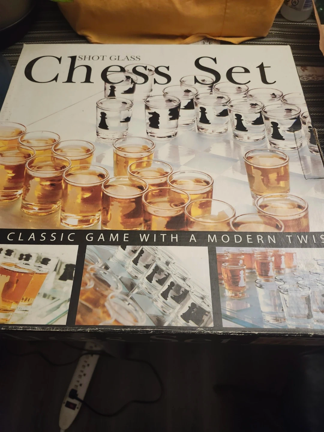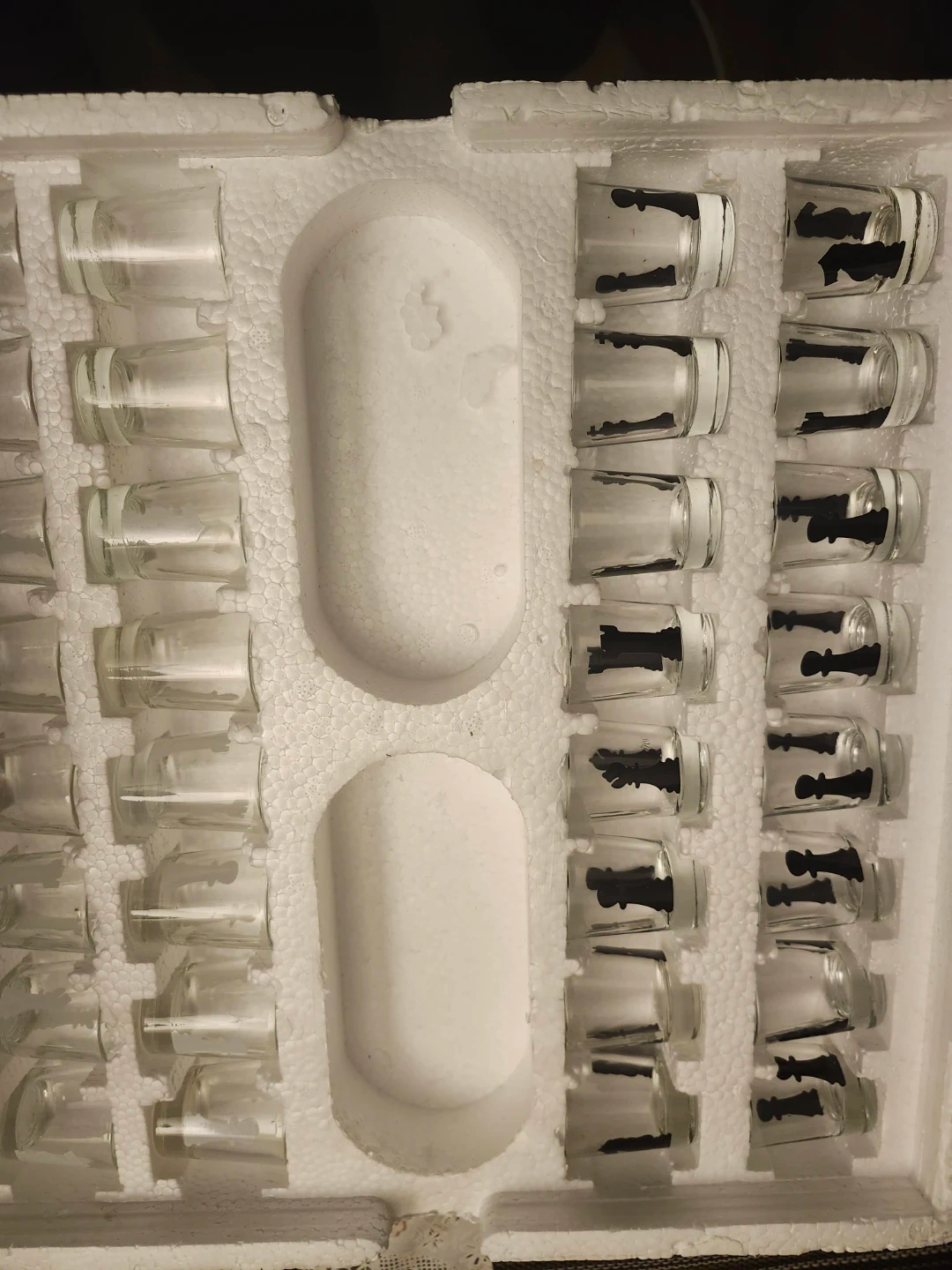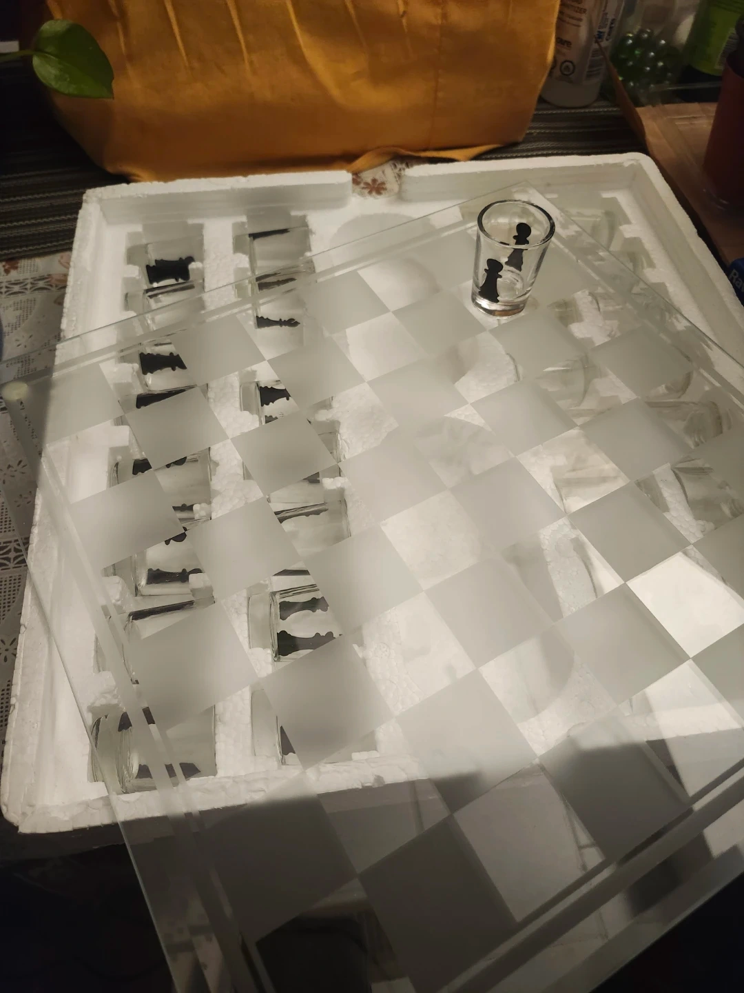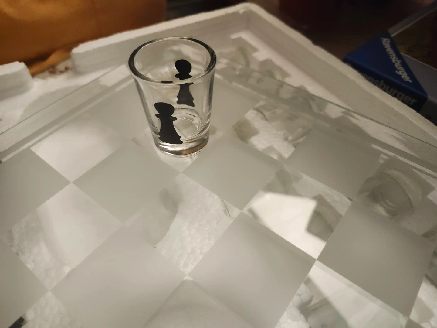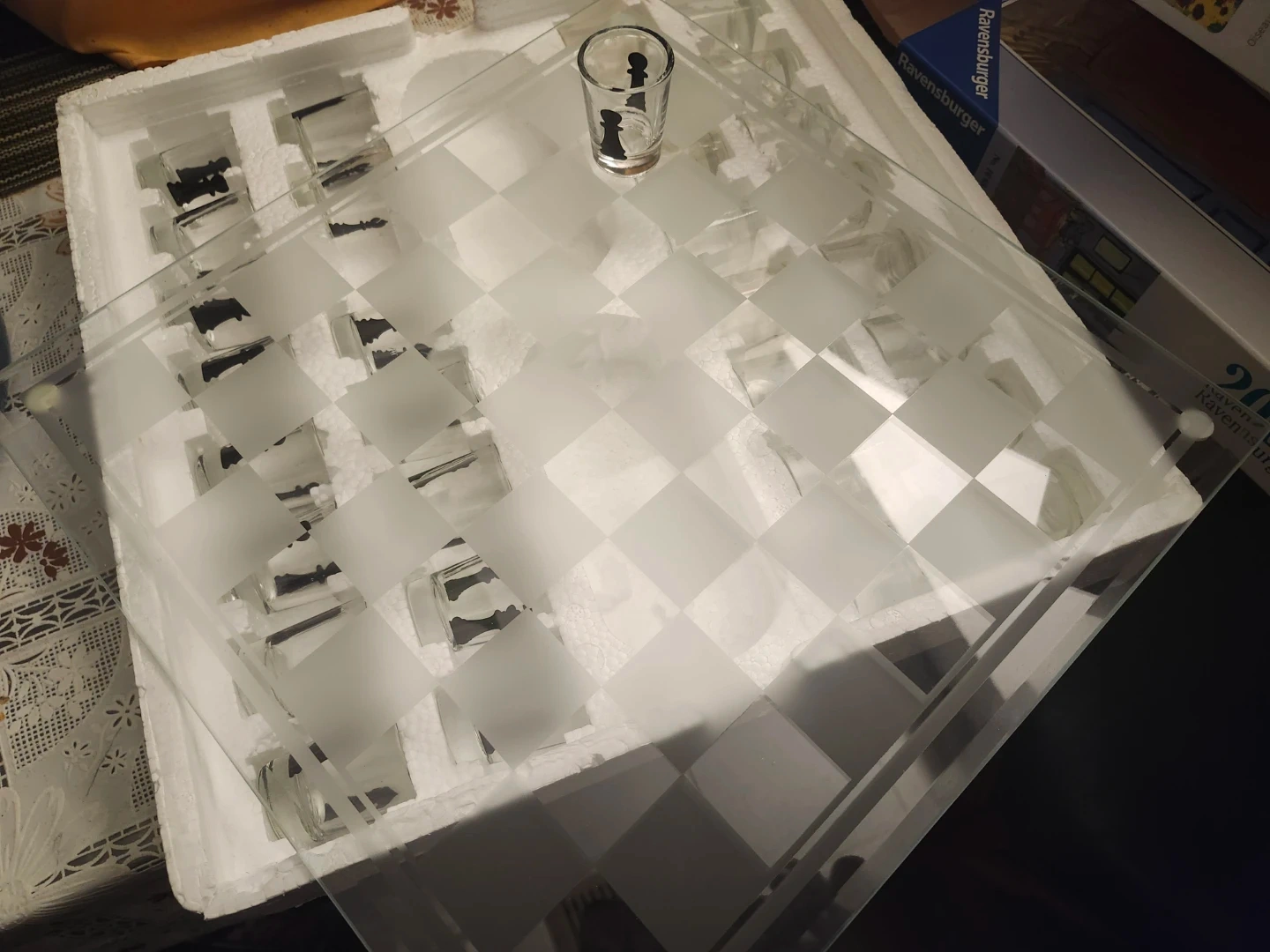 Selling a shot glass chess set! It's a classic game with a modern twist, perfect for some fun. The set includes the chess board and all the shot glass pieces. in box.