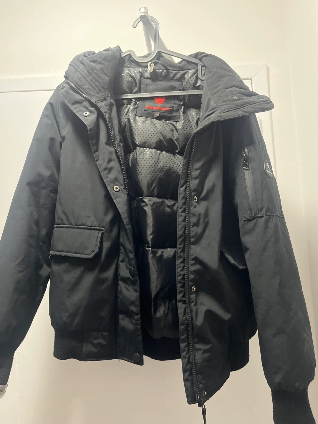 Selling a black down-filled bomber jacket from Canadiana. It's in great condition and ready for the colder weather! Size is M/M.