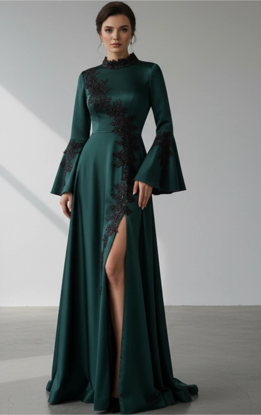Beautiful green maxi dress featuring elegant black lace detailing. This dress has a high neckline and long sleeves with flared cuffs, and a stylish slit. Perfect for a special occasion!