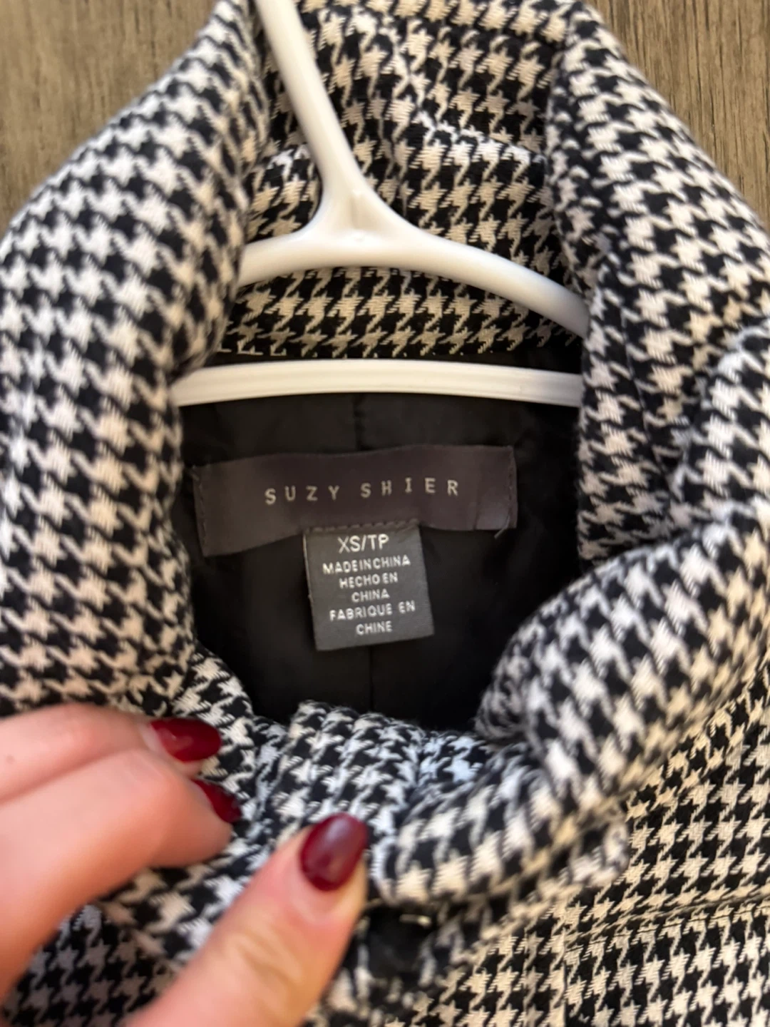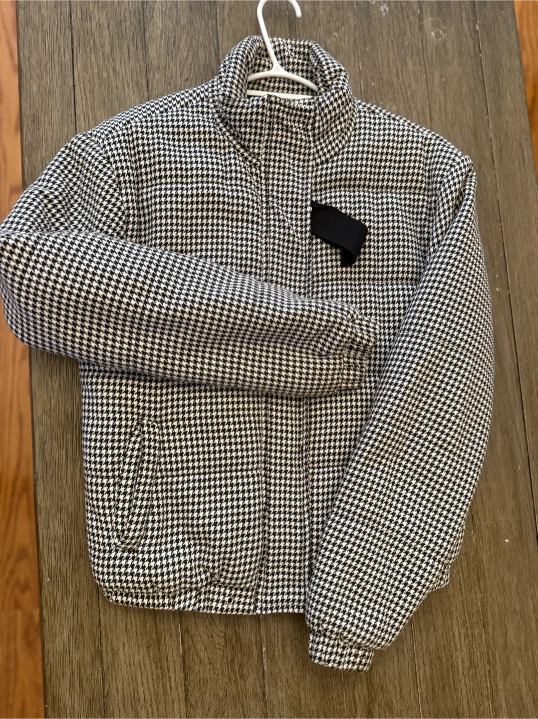 Here's a cute Suzy Shier puffer jacket in a classic houndstooth pattern! It's a size XS and perfect for adding a bit of style to your outerwear collection