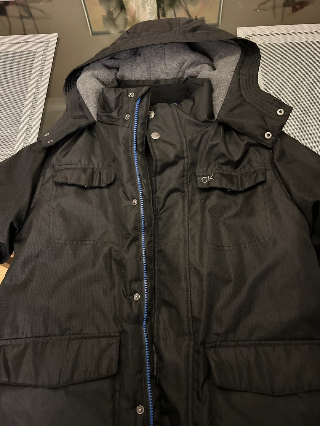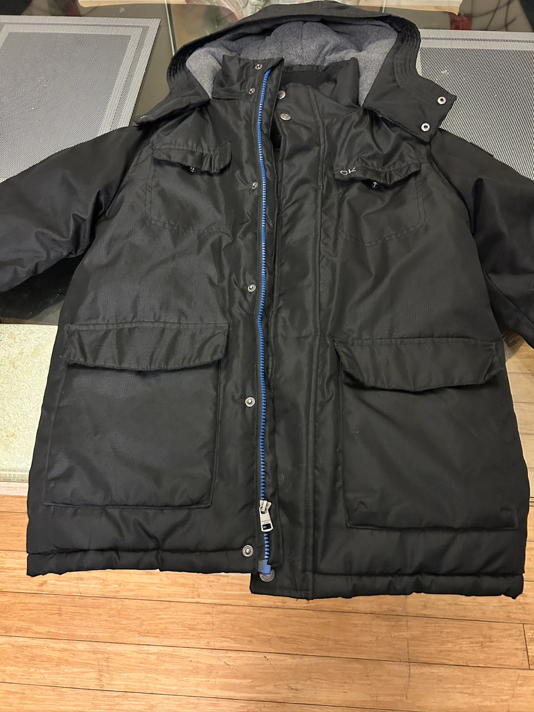 Selling a Calvin Klein Youth winter jacket in black. It's in great condition and perfect for the cold weather! The jacket features a hood and several pockets, making it both stylish and functional. Size is M (10/12). Youth ages 10 to 12 slim fit