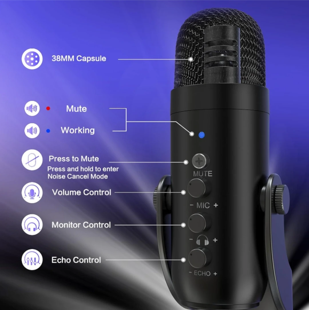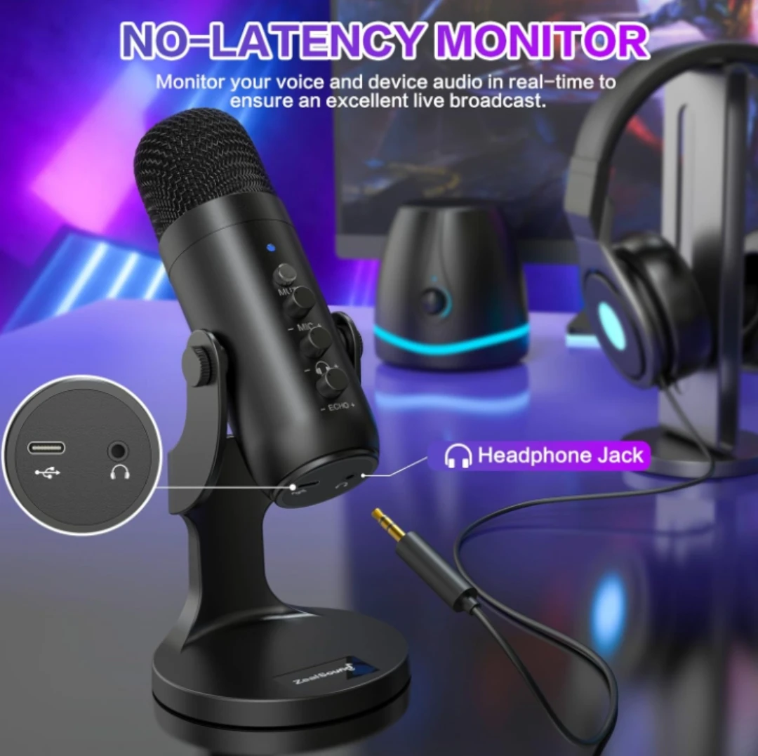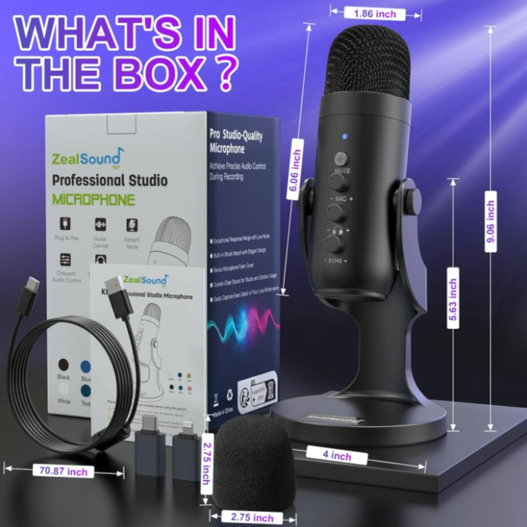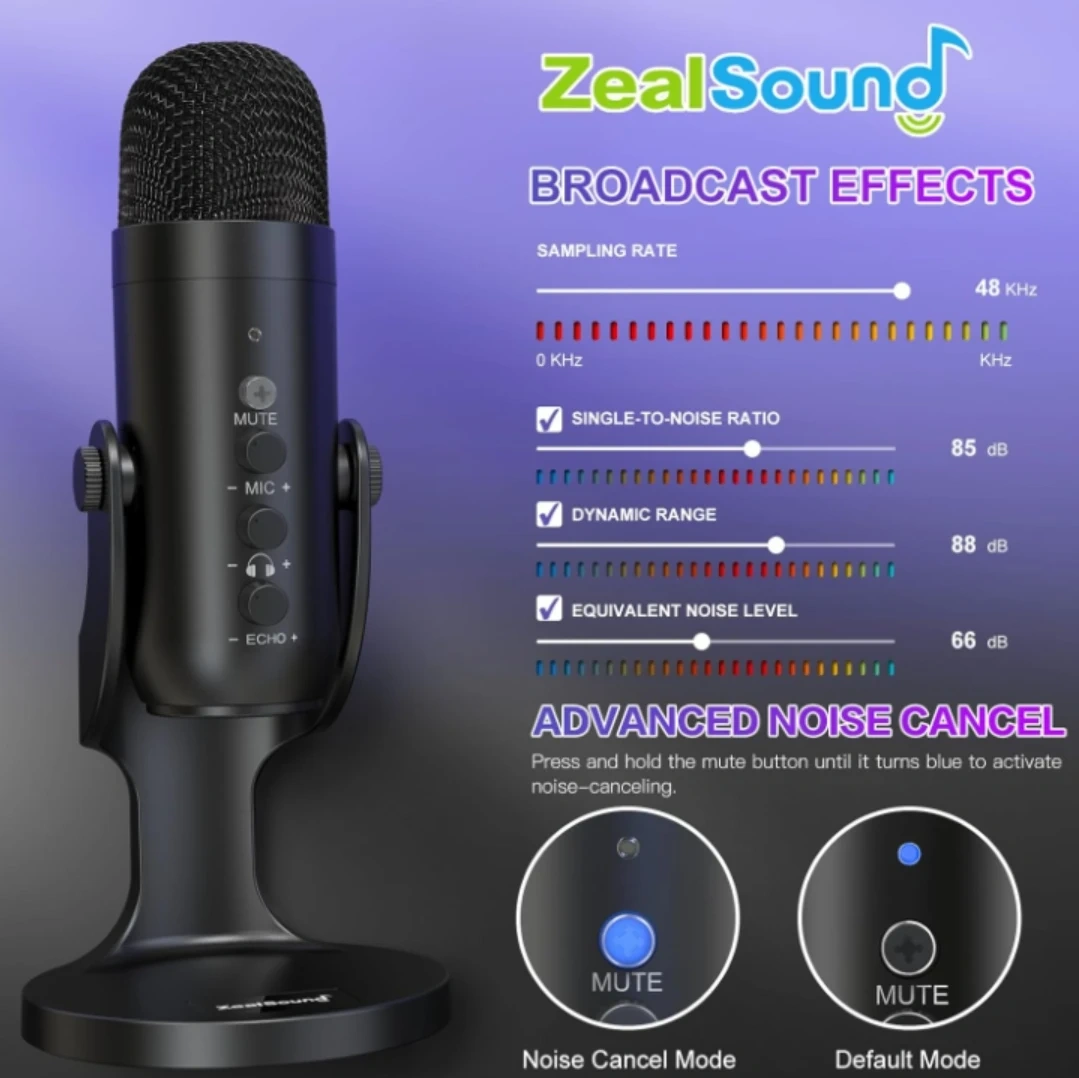 This ZealSound condenser microphone is perfect for desktop use with iPhones, iPads, Android devices, PCs, and tablets. It features plug & play compatibility and advanced noise cancellation.