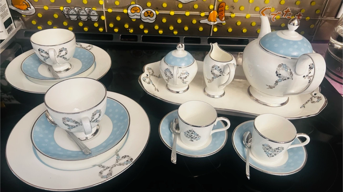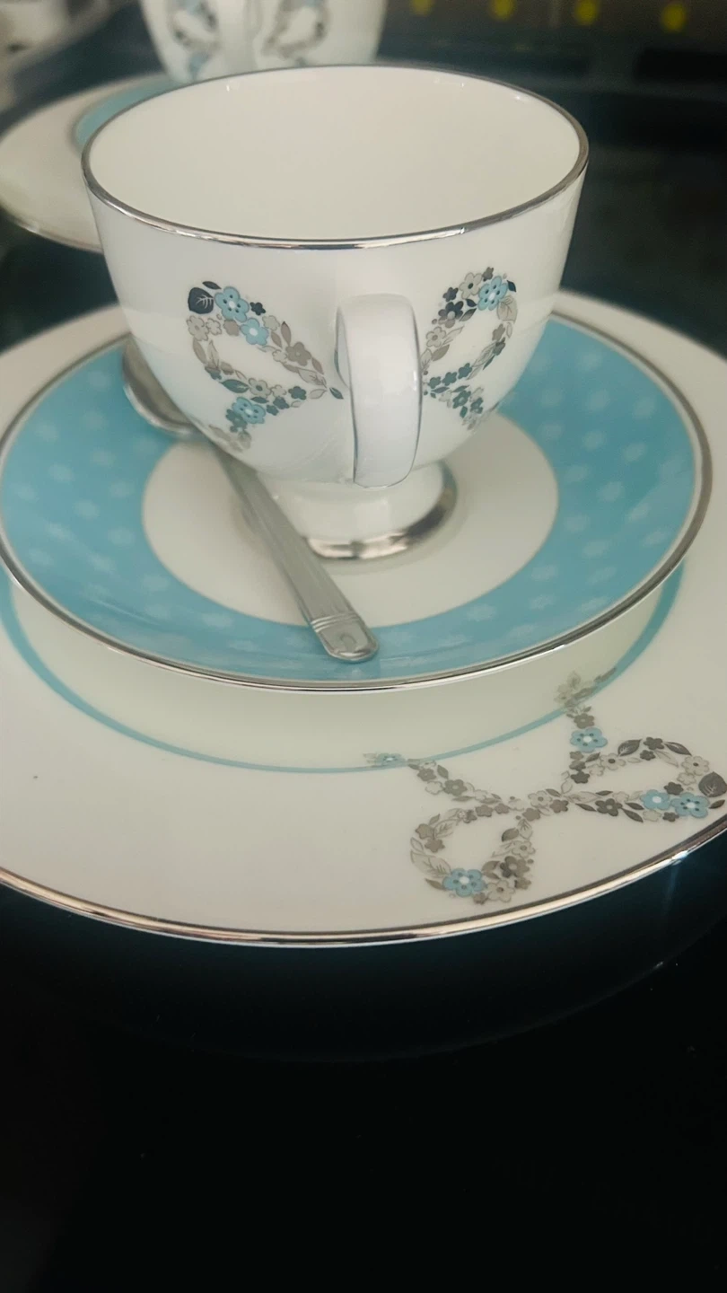 Made in Japan. Selling a beautiful Narumi Bone China tea set! It includes a teapot, sugar bowl, creamer, four cups, four saucers, four plates, and four spoons. The set is white with a light blue accent colour and a delicate floral design. Perfect for tea parties or adding a touch of elegance to your home!