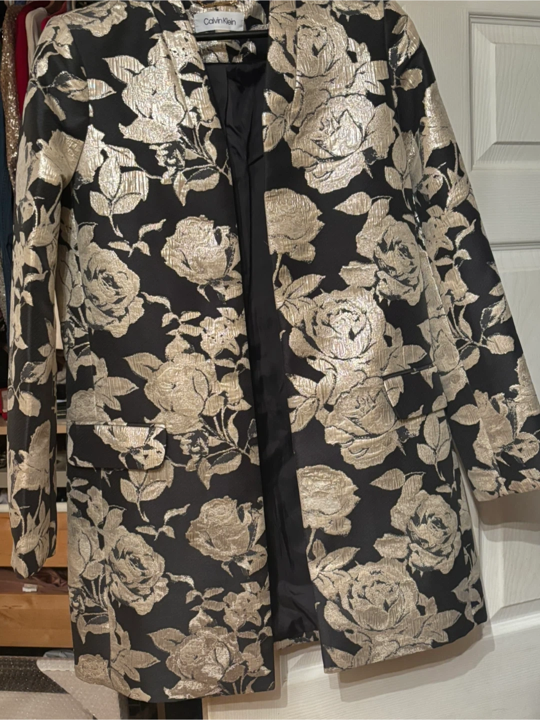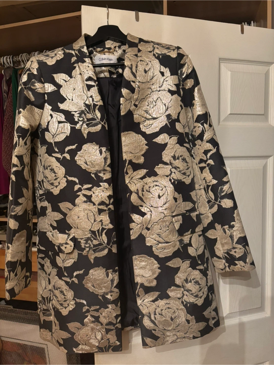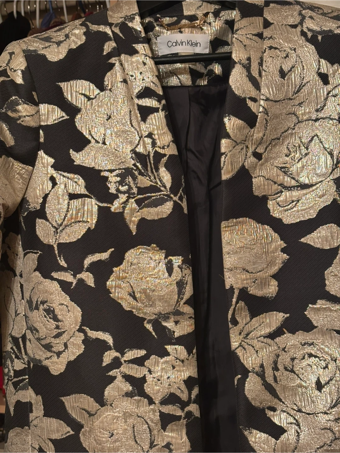 Beautiful embossed Calvin Klein blazer with a black and gold floral pattern. Excellent condition-only worn once!