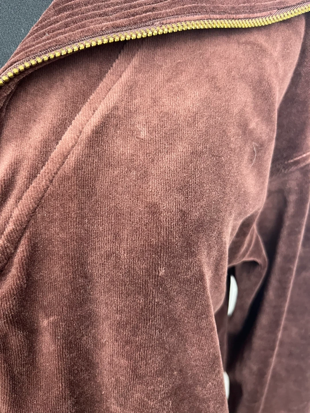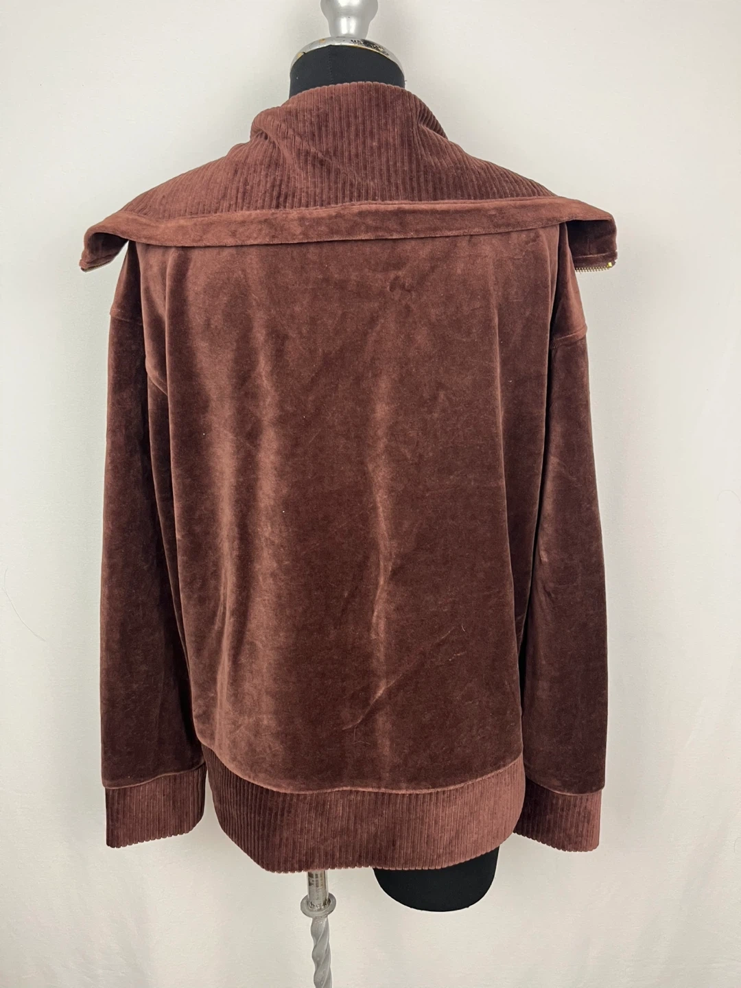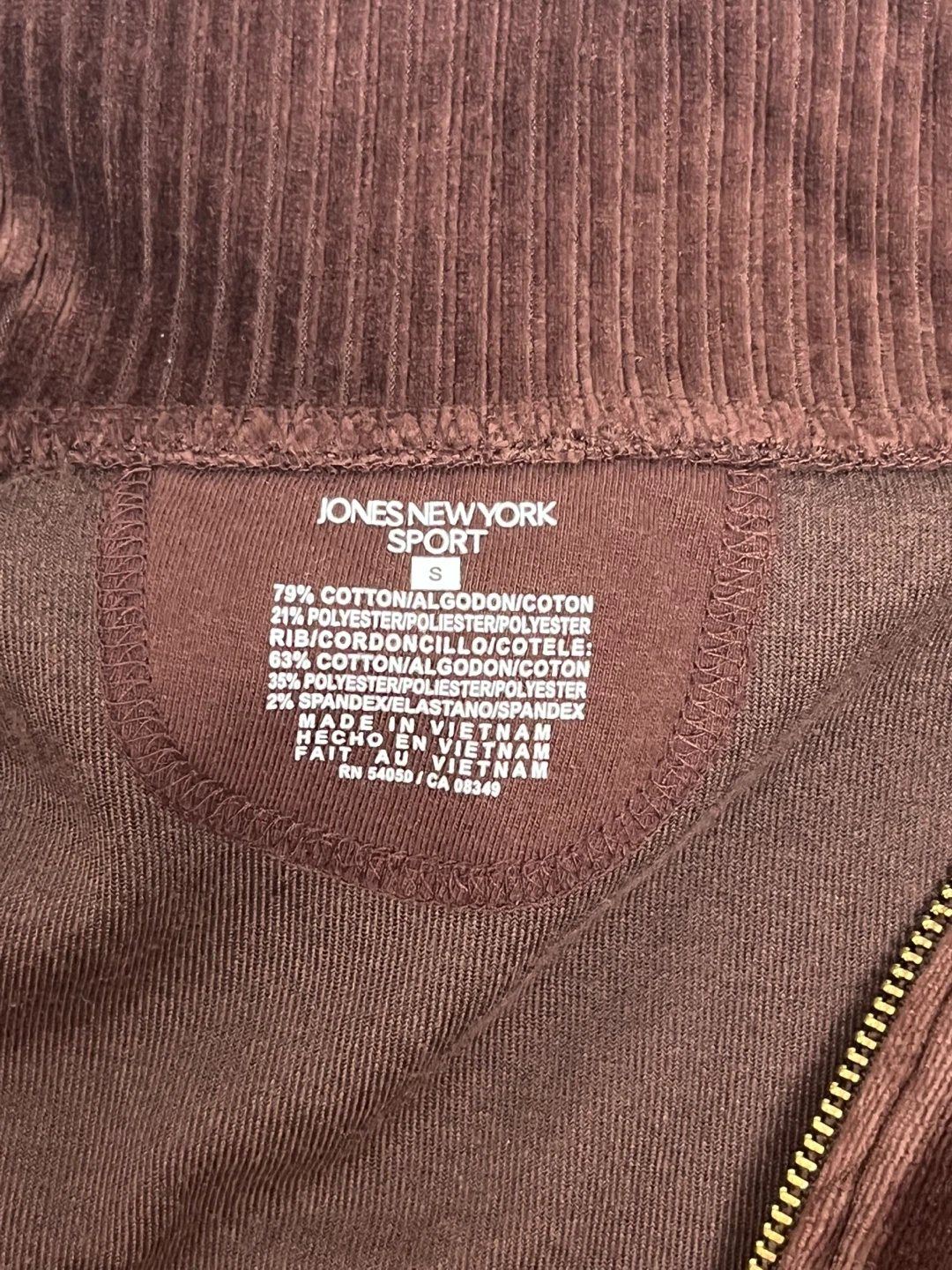 Here's a cozy Jones New York Sport jacket in a lovely brown velour material! It's a size small and made of a comfortable blend of cotton, polyester, and spandex. Perfect for adding a touch of warmth and style to your outfit.