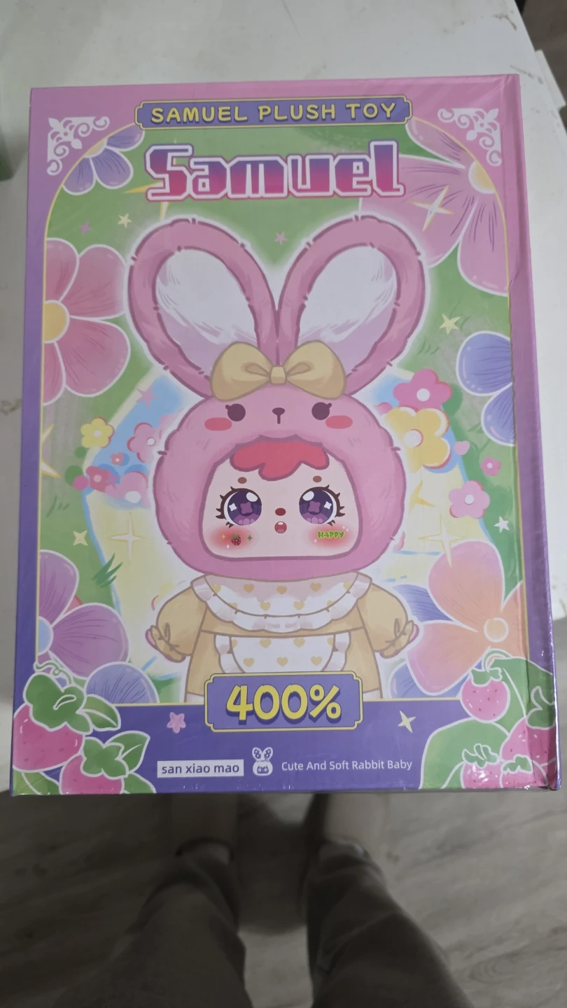 Selling a cute Samuel plush toy! It's a soft rabbit baby in a box. The box says 'Cute And Soft Rabbit Baby' and '400%'.