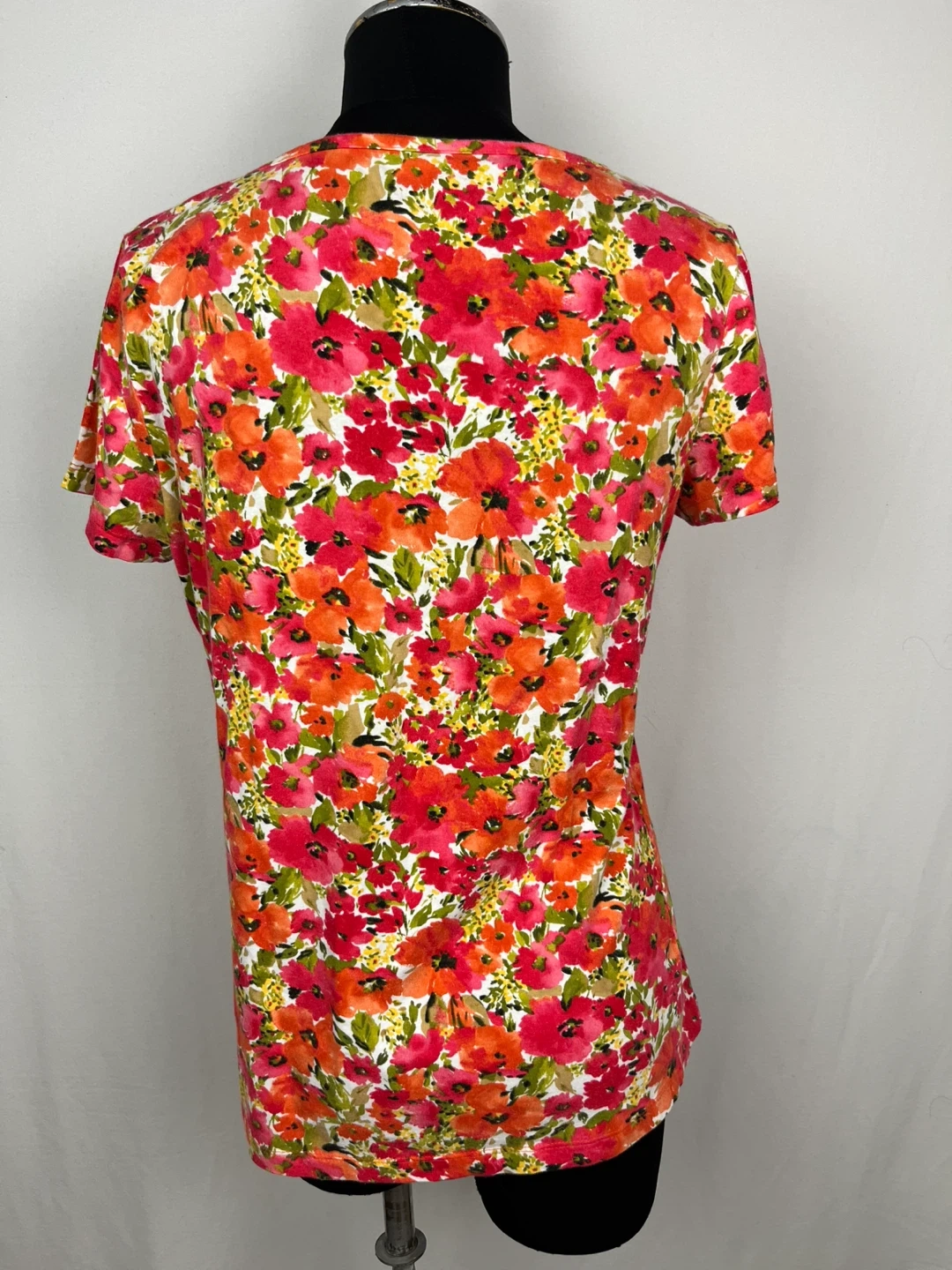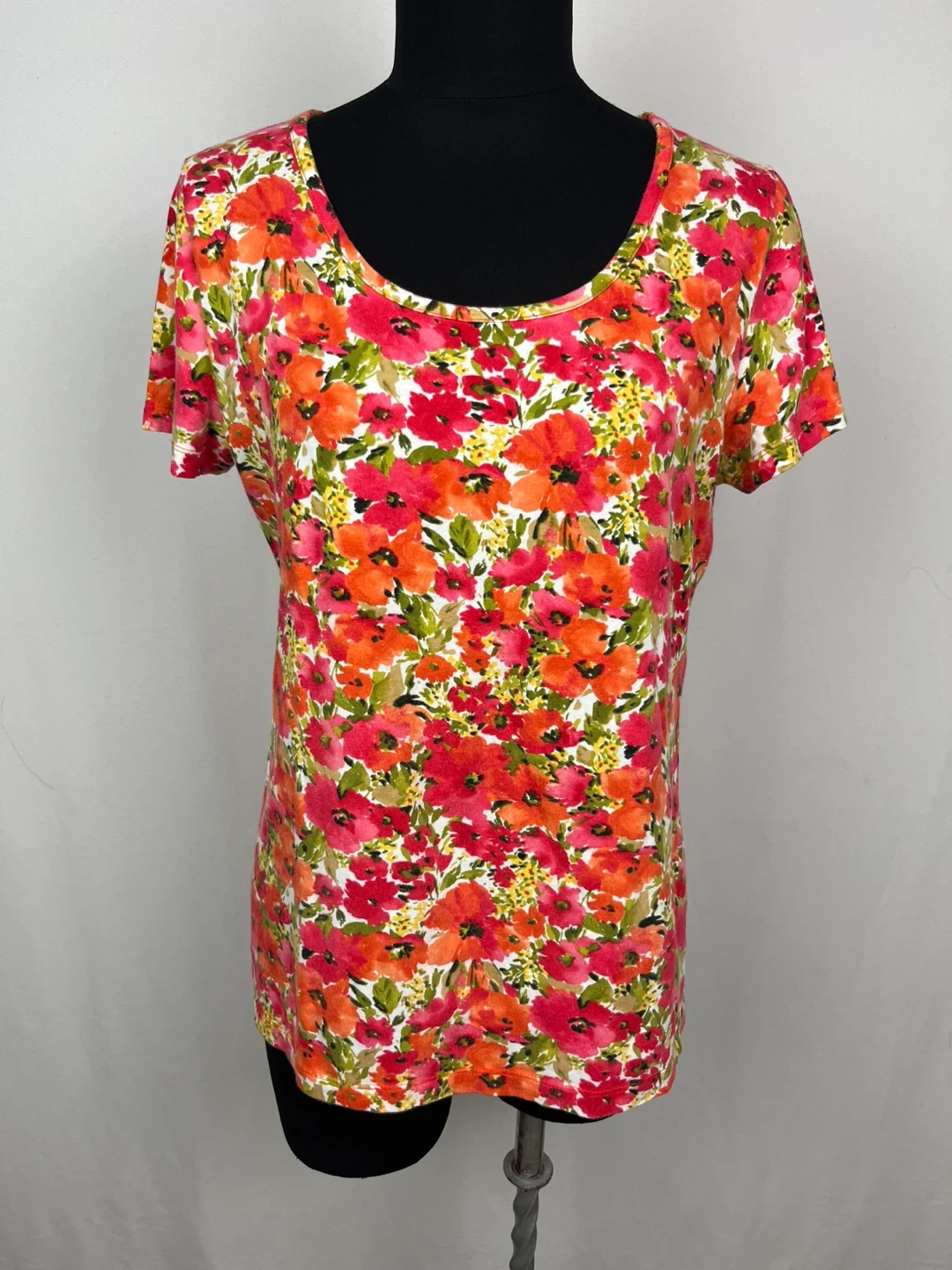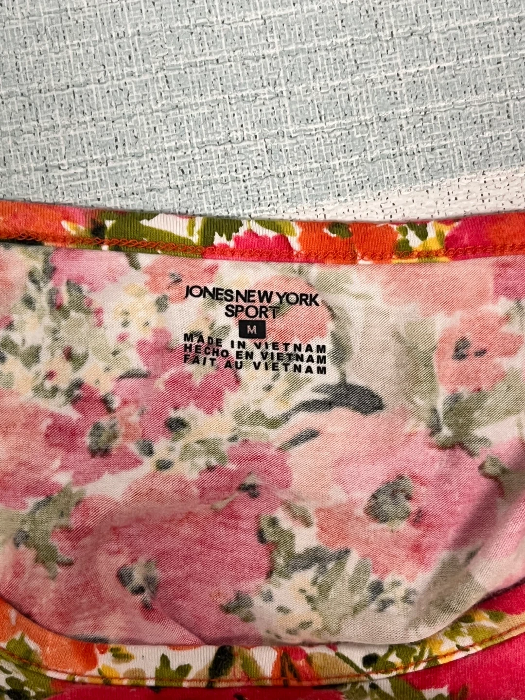 Here's a lovely floral tee from Jones New York Sport! It's a size medium and features a vibrant floral pattern with reds, oranges, and greens. Perfect for adding a pop of colour to your wardrobe.