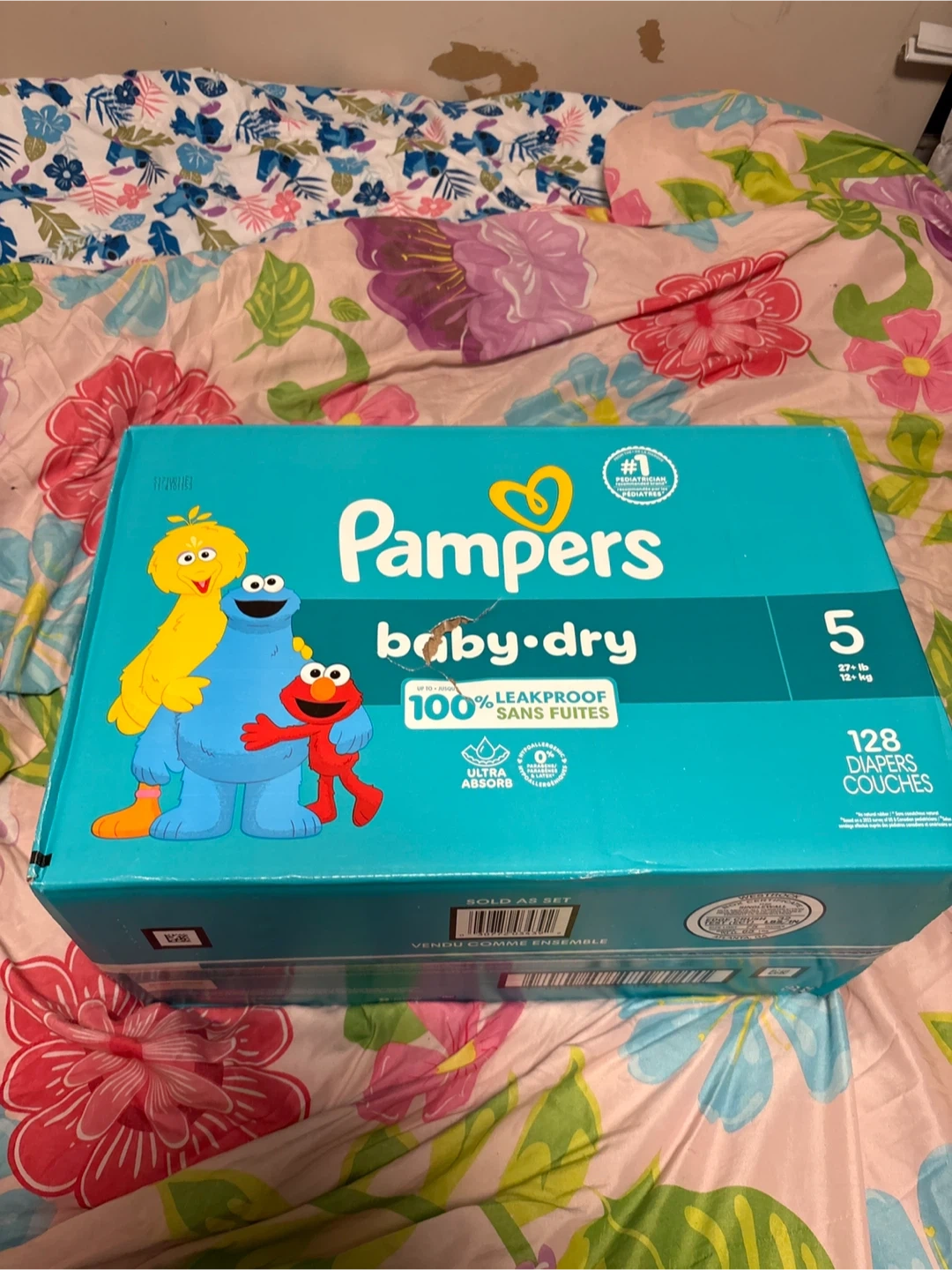 Selling a box of Pampers Baby-Dry diapers, size 5. This box contains 128 diapers for babies 27+ lbs (12+ kg). They're 100% leakproof, offering ultra absorbency!