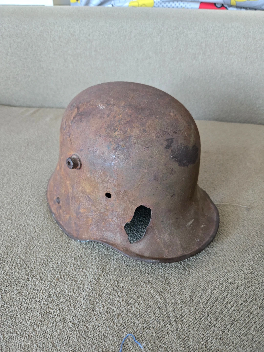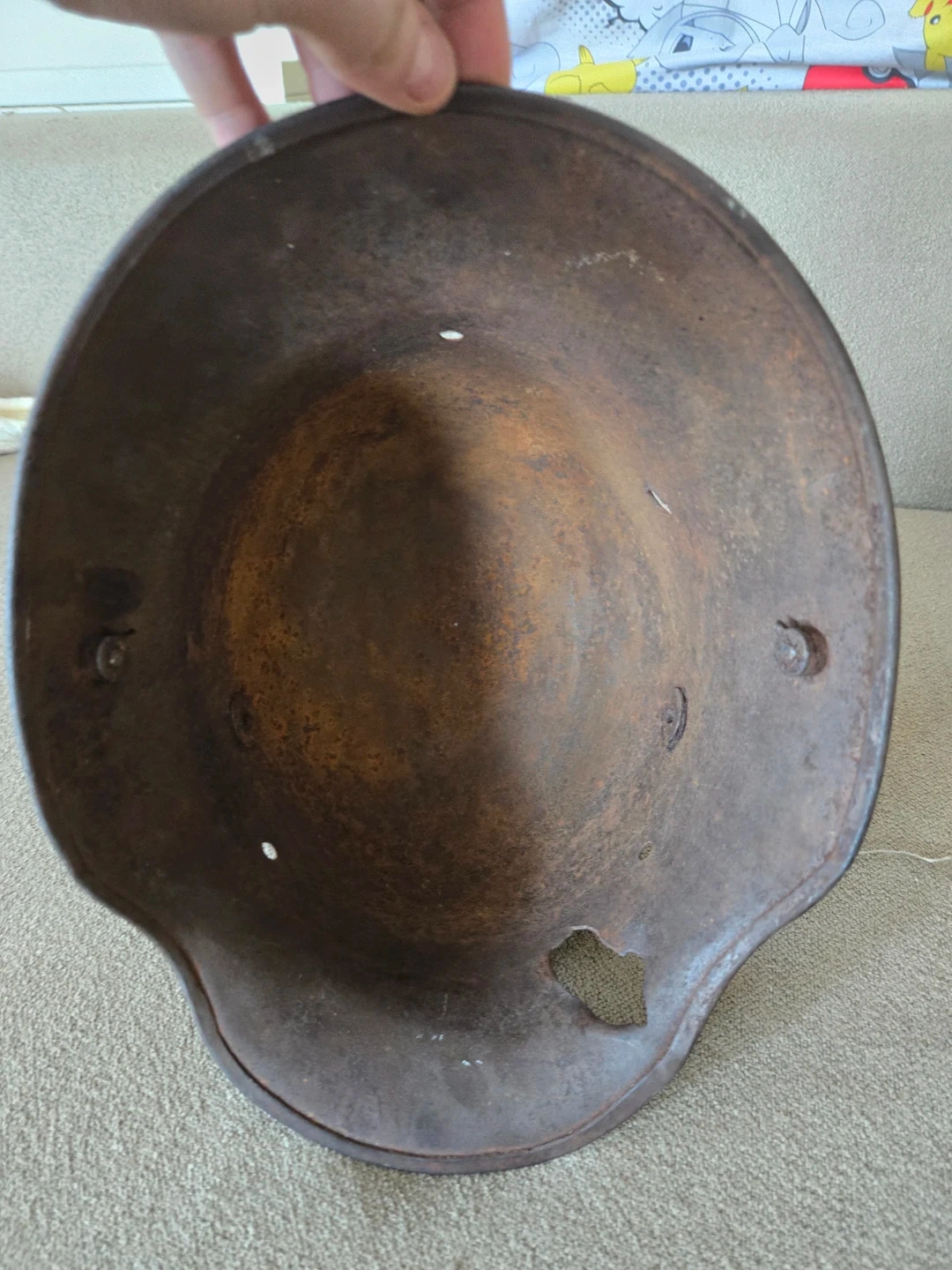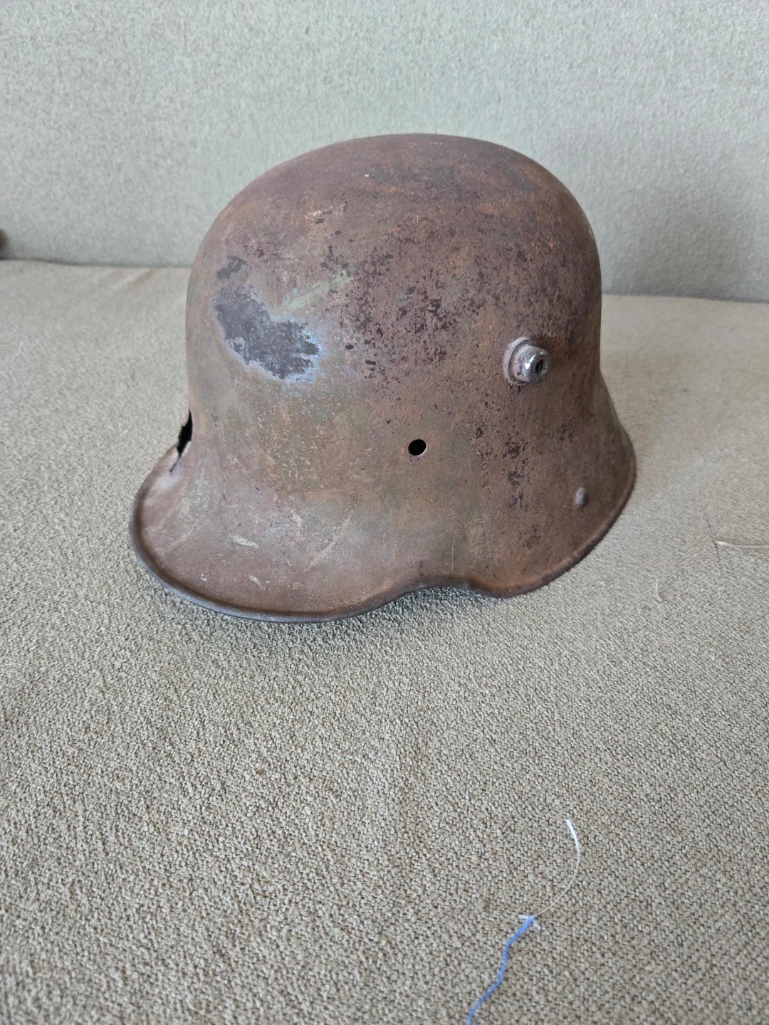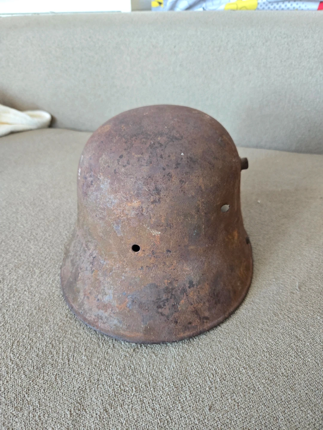Original, battle worn World War I German army helmet no liner has bullet entry hole in the rear, and bullet exit hole in front. The rest is only surface rust and the helmet is not fragile in any way. There are signs of some personalization and customization on the outer shell of the helmet there are remnants of paint that are visible in shades of green and brown. The helmet is an M16 model size ET64 (the stamp is still visible on the inside of the helmet) this particular piece of memorabilia tells an interesting story it's very rare to have a helmet with still visible traces of custom camo painted by the soldier and a bullet hole in the back of a helmet and especially rare occurrence during World war 1 because of face to face trench fighting.