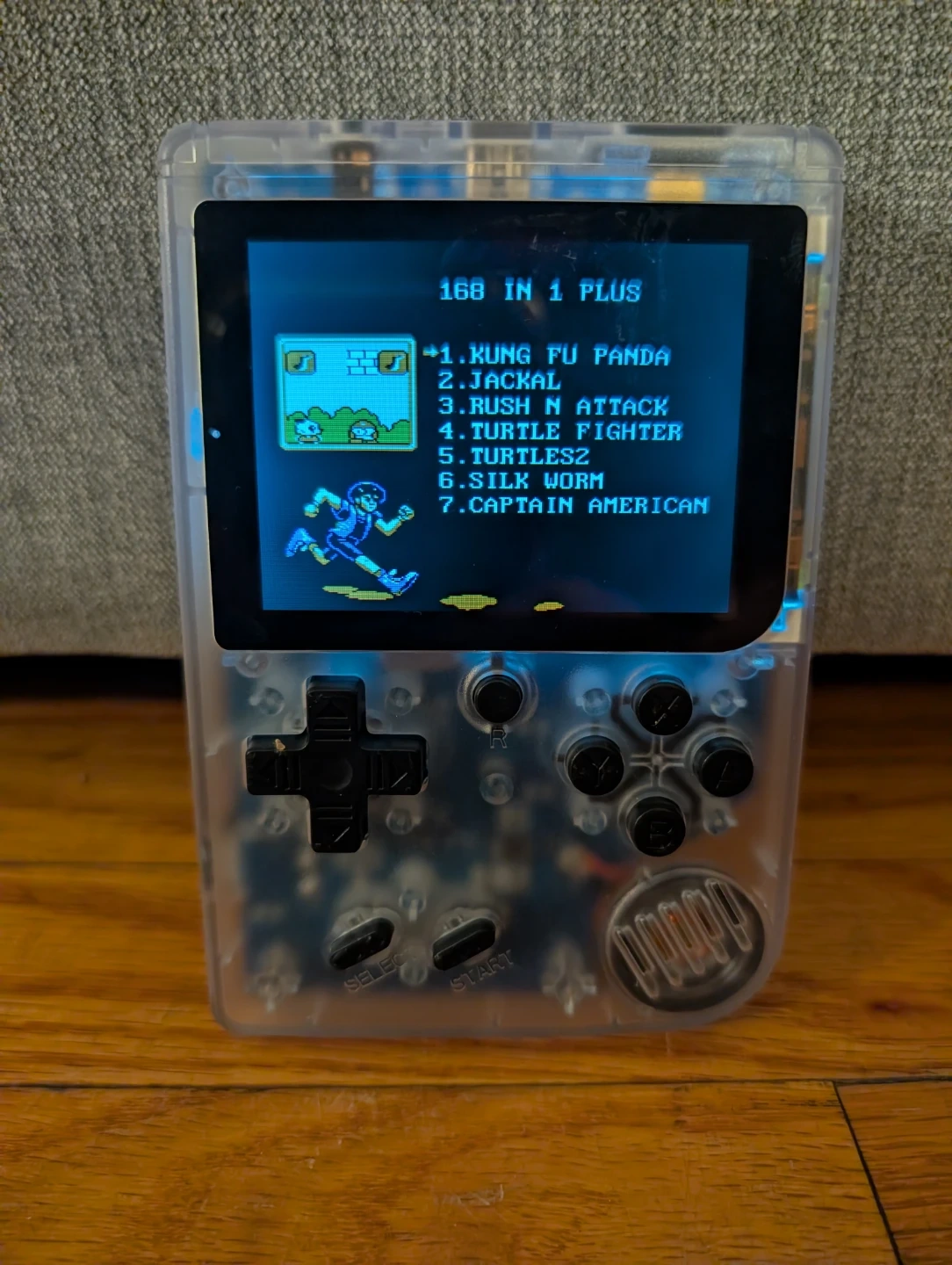 Selling a retro handheld game console pre-loaded with 168 games built in! It's brand new condition and comes with a charging cable. Enjoy classics like Tetris, Jackal, Rush N Attack, and more!