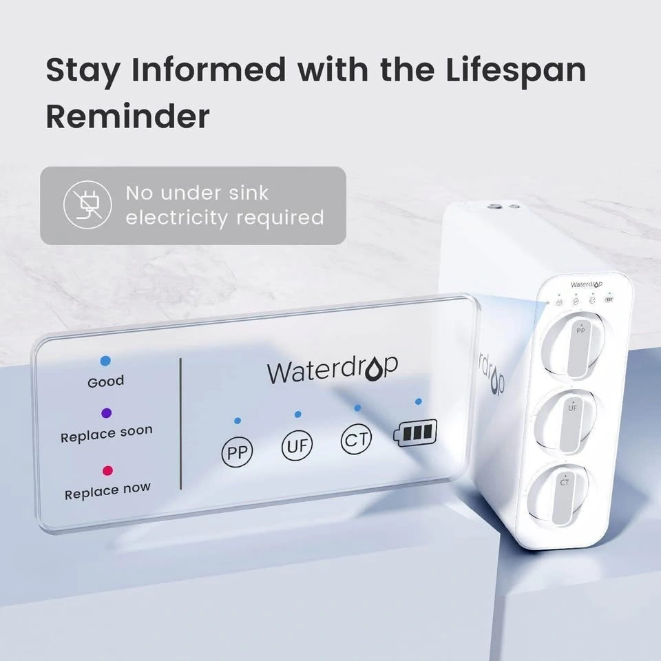 Waterdrop Ultra Filtration system is an innovative, all-in-one intelligent water purification system. The waterdrop water filter for sink comes with a stainless steel faucet, a 3/8 inch inlet hose, a 1/4 inch outlet hose, a 3/8 inch -1/2 inch feed water adapter, and other necessary accessories. In just a few minutes, Waterdrop Ultra Filtration system can be installed completely, and in just three seconds, the filter can be changed with one single twist-pull. Installation is that easy!