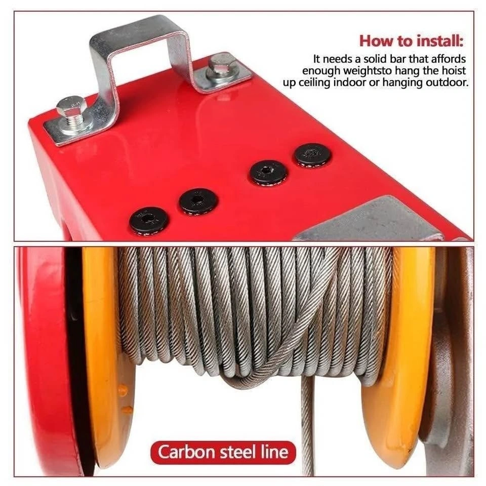 The electric hoist body is made of heavy duty steel, resistant to corrosion, rust, and wear. Steel hooks meet the demand on high strength and high hardness, each hook can lift 660lbs goods.