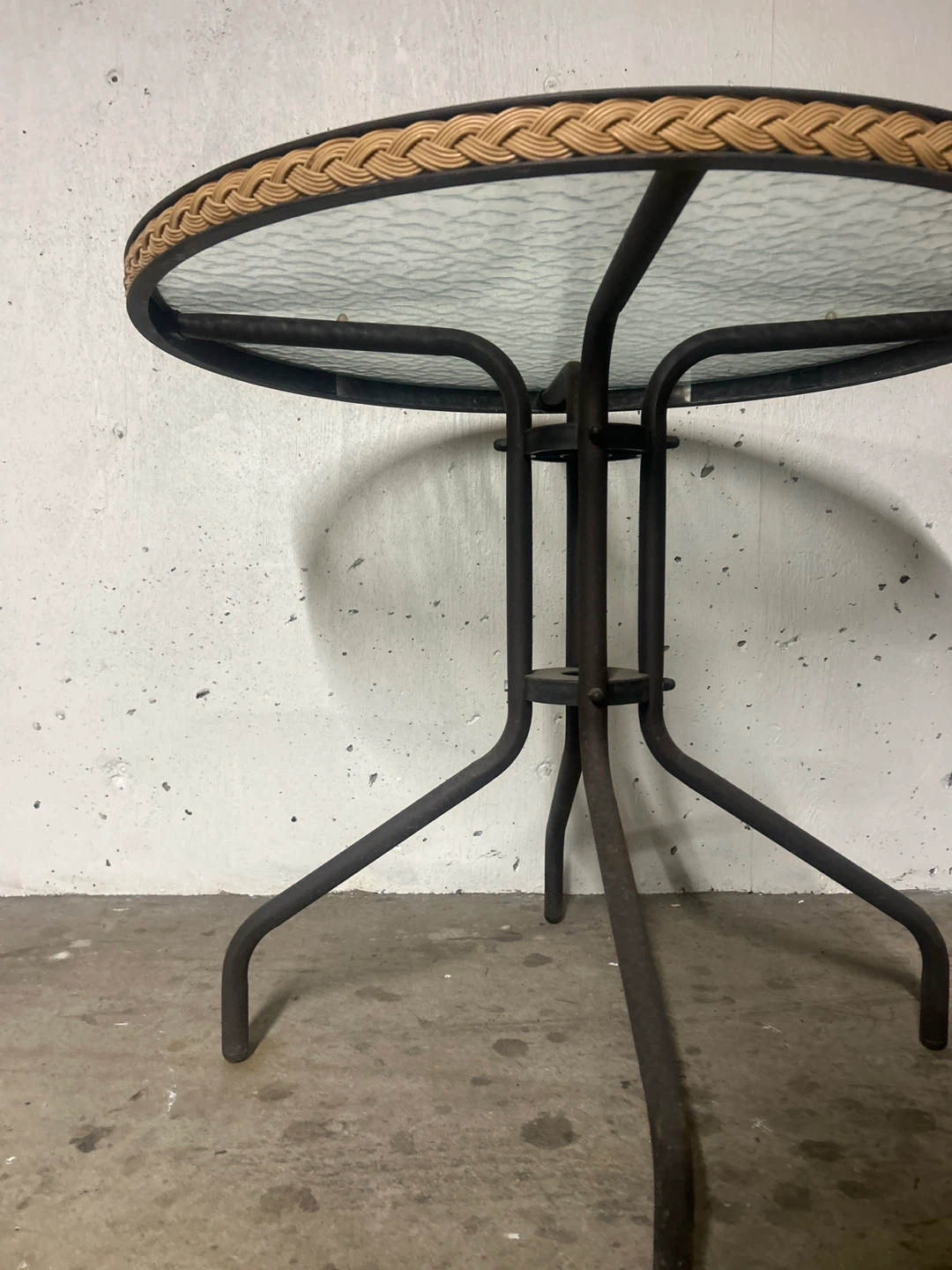 Selling a round glass top patio table. It features a metal frame and a decorative woven edge around the glass. Perfect for a small outdoor space or balcony