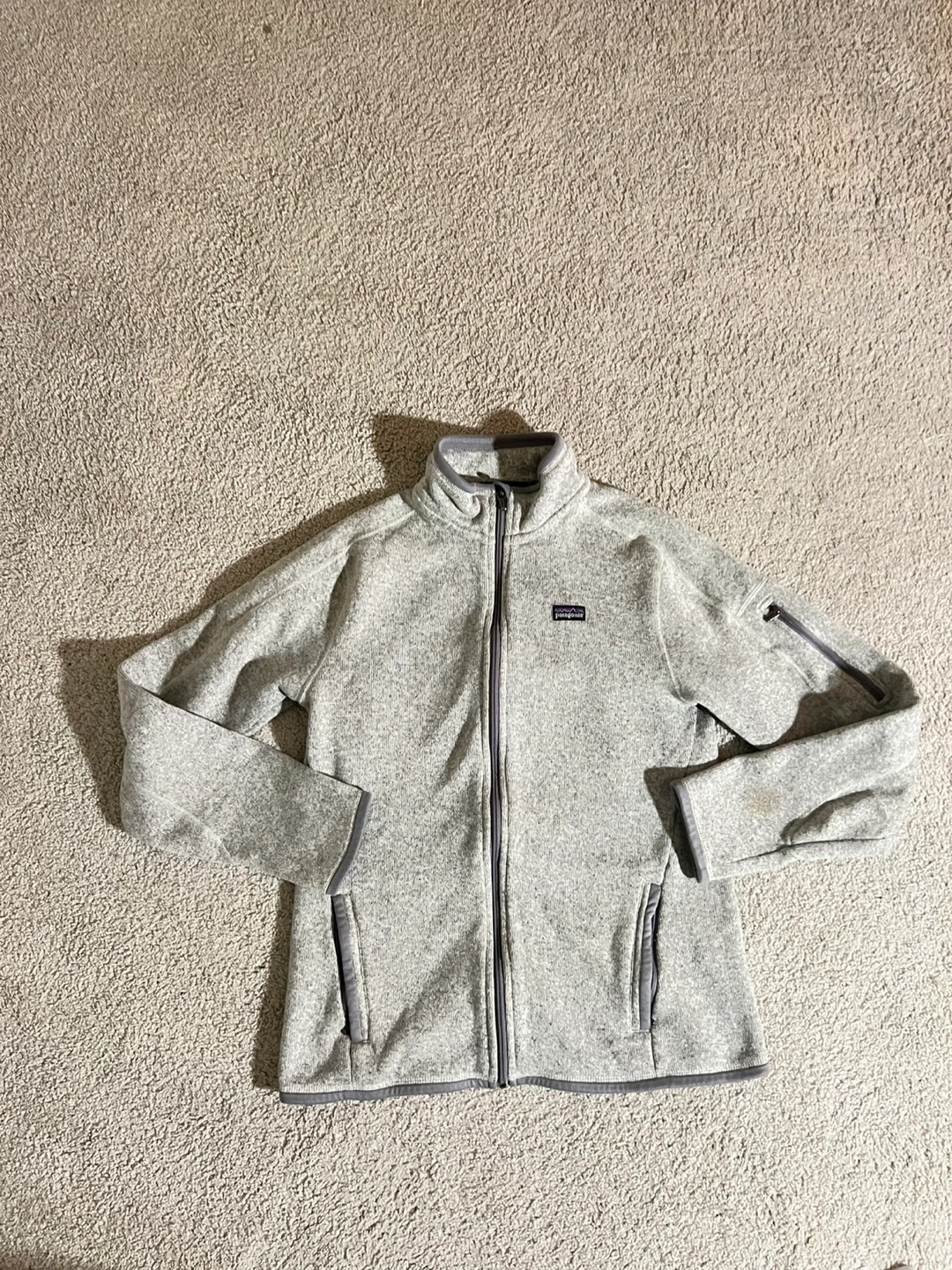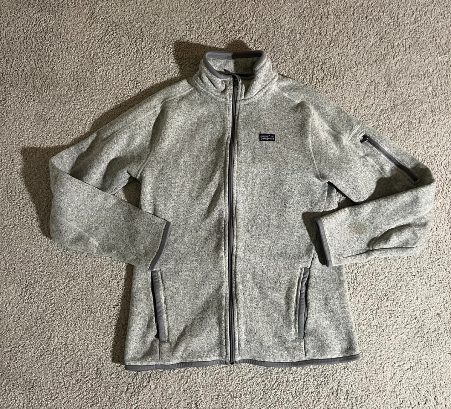 Selling a Patagonia Better Sweater fleece jacket in a lovely grey colour! It's in great condition and perfect for layering. One small bleach stain on the right arm (visible in photo)