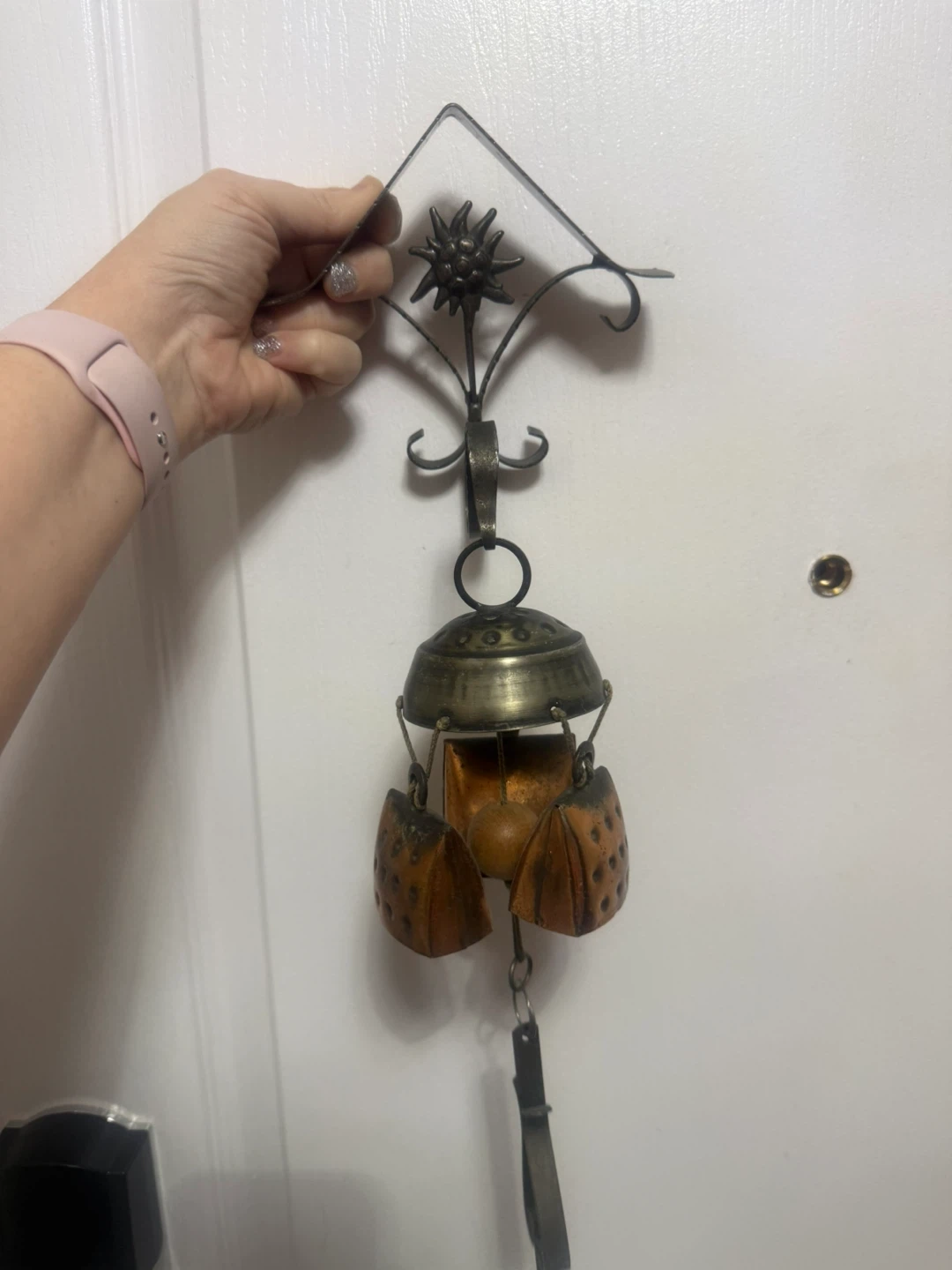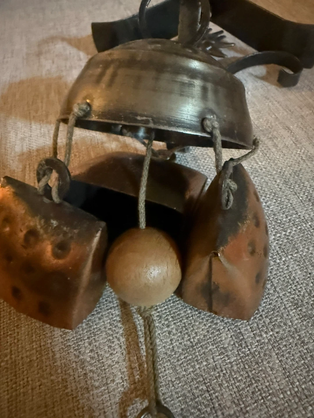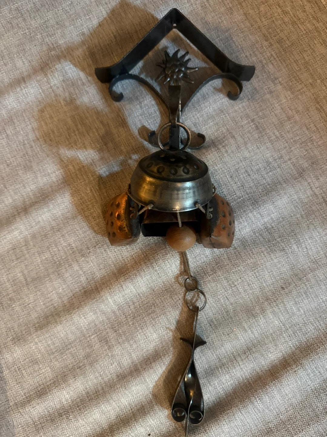 Selling a vintage metal Swiss cow bell. It has a unique design with a sunburst detail and hanging elements. It would make a great decorative piece!
