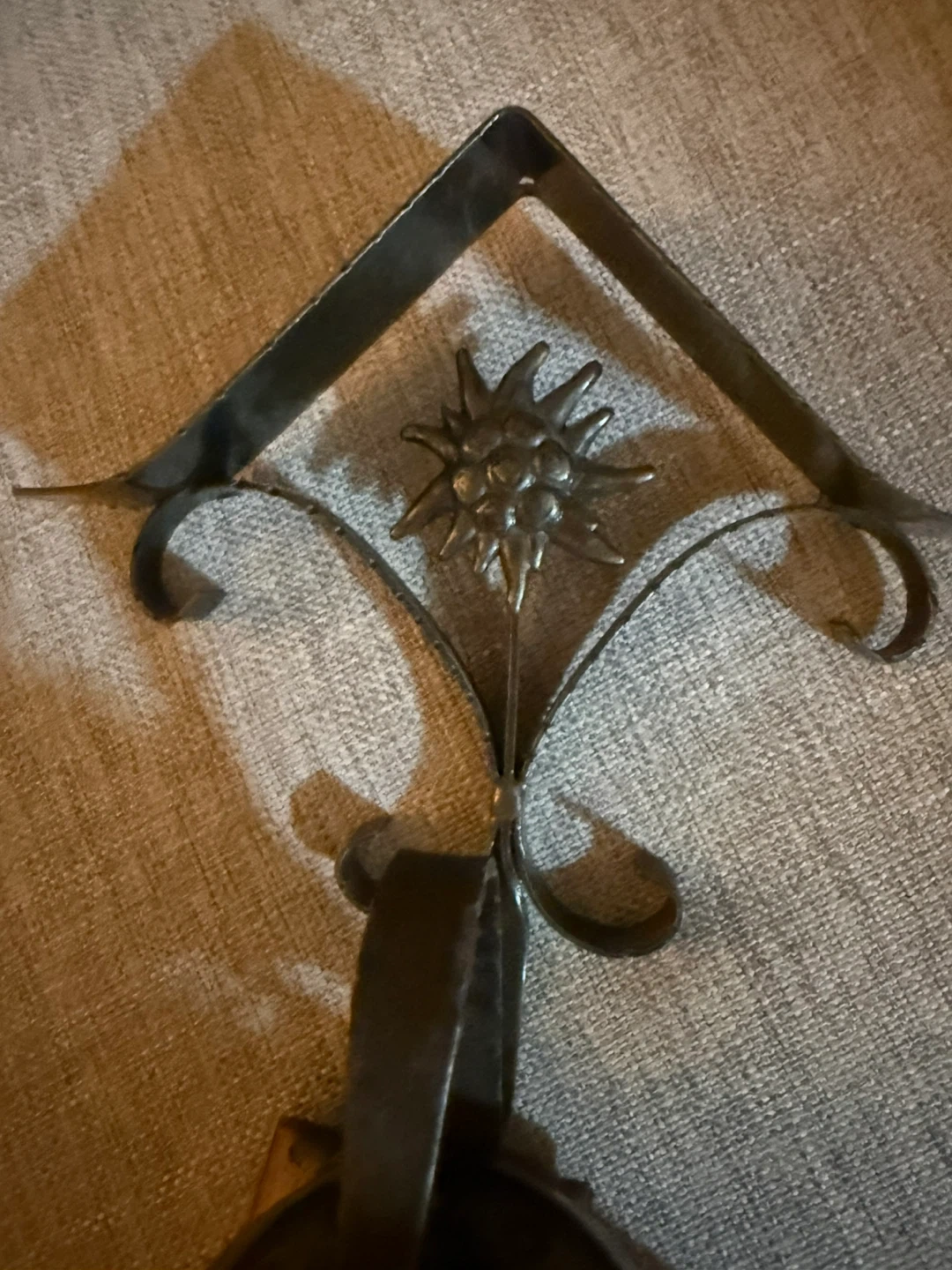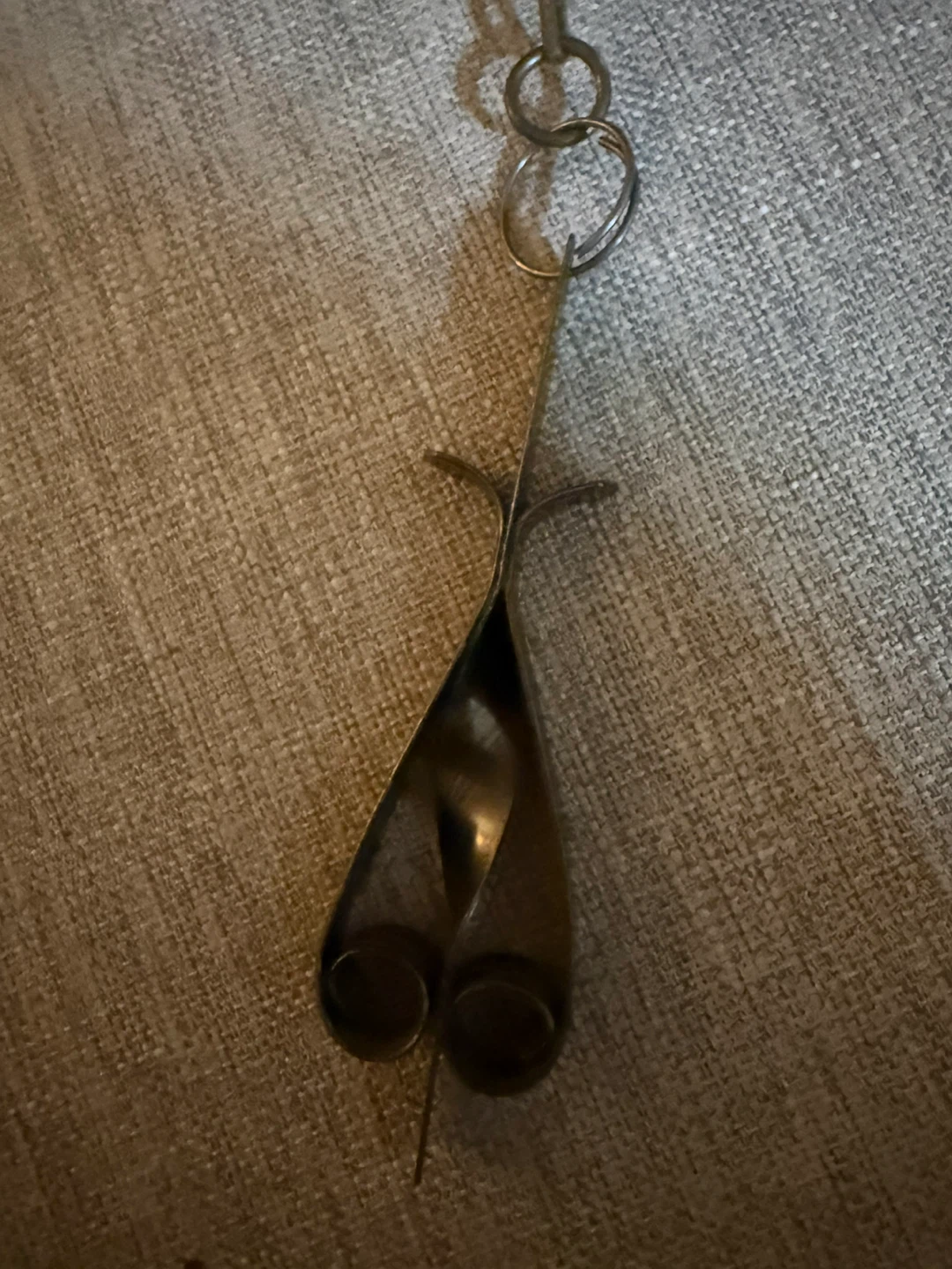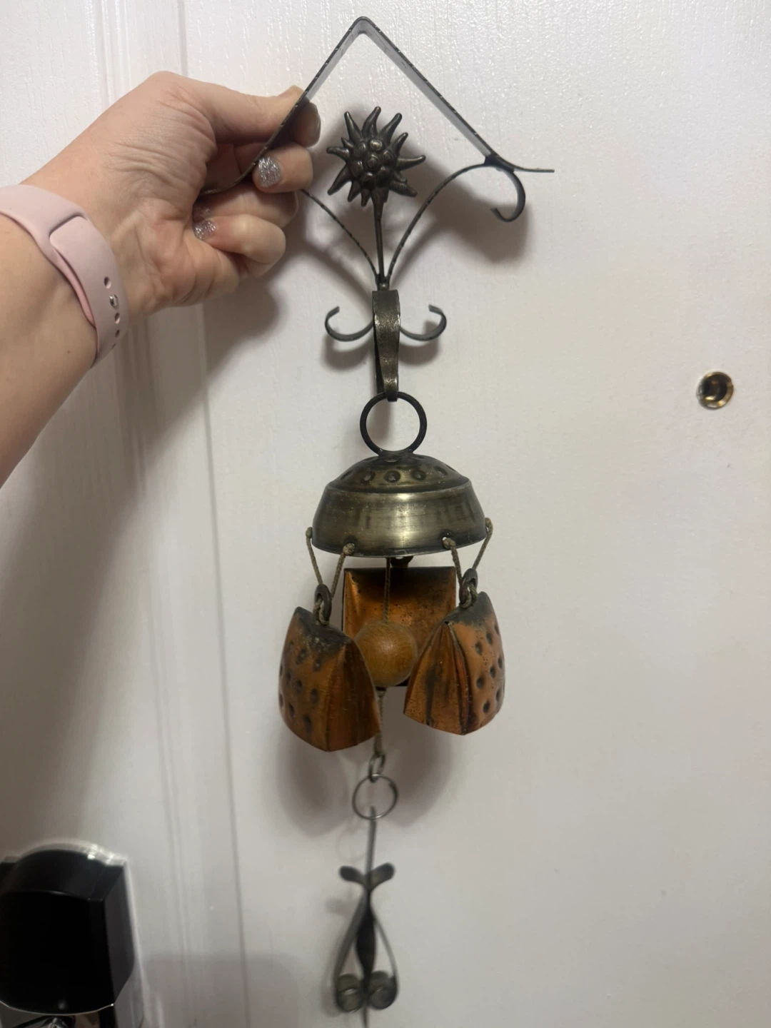 Selling a vintage metal Swiss cow bell. It has a unique design with a sunburst detail and hanging elements. It would make a great decorative piece!