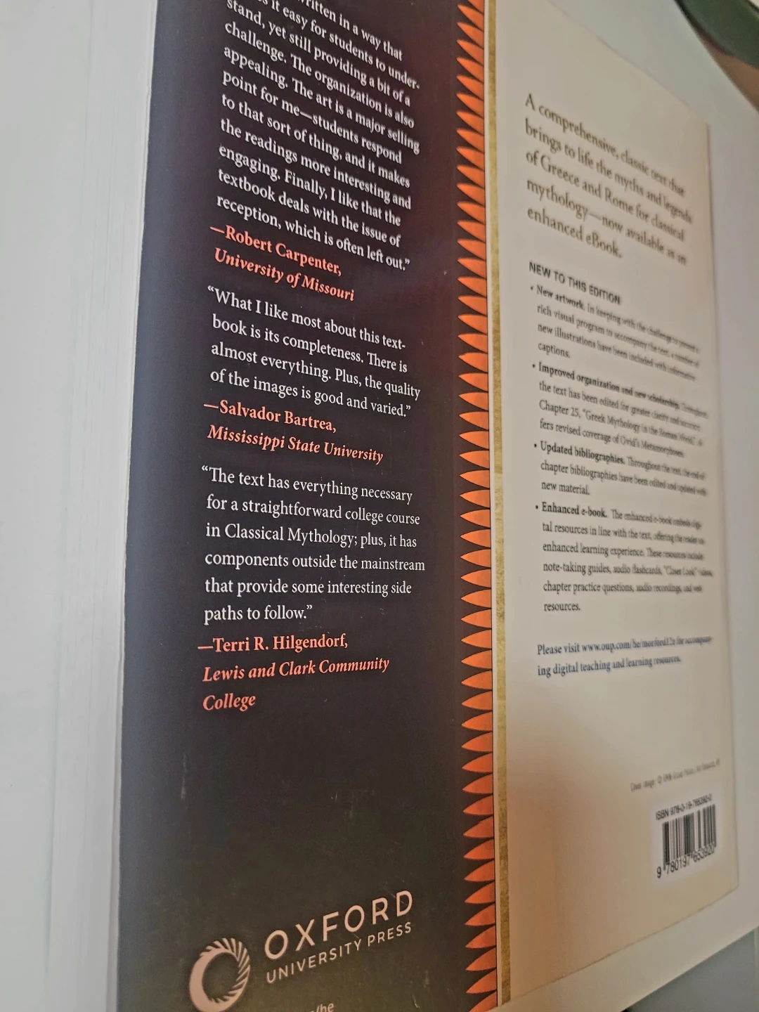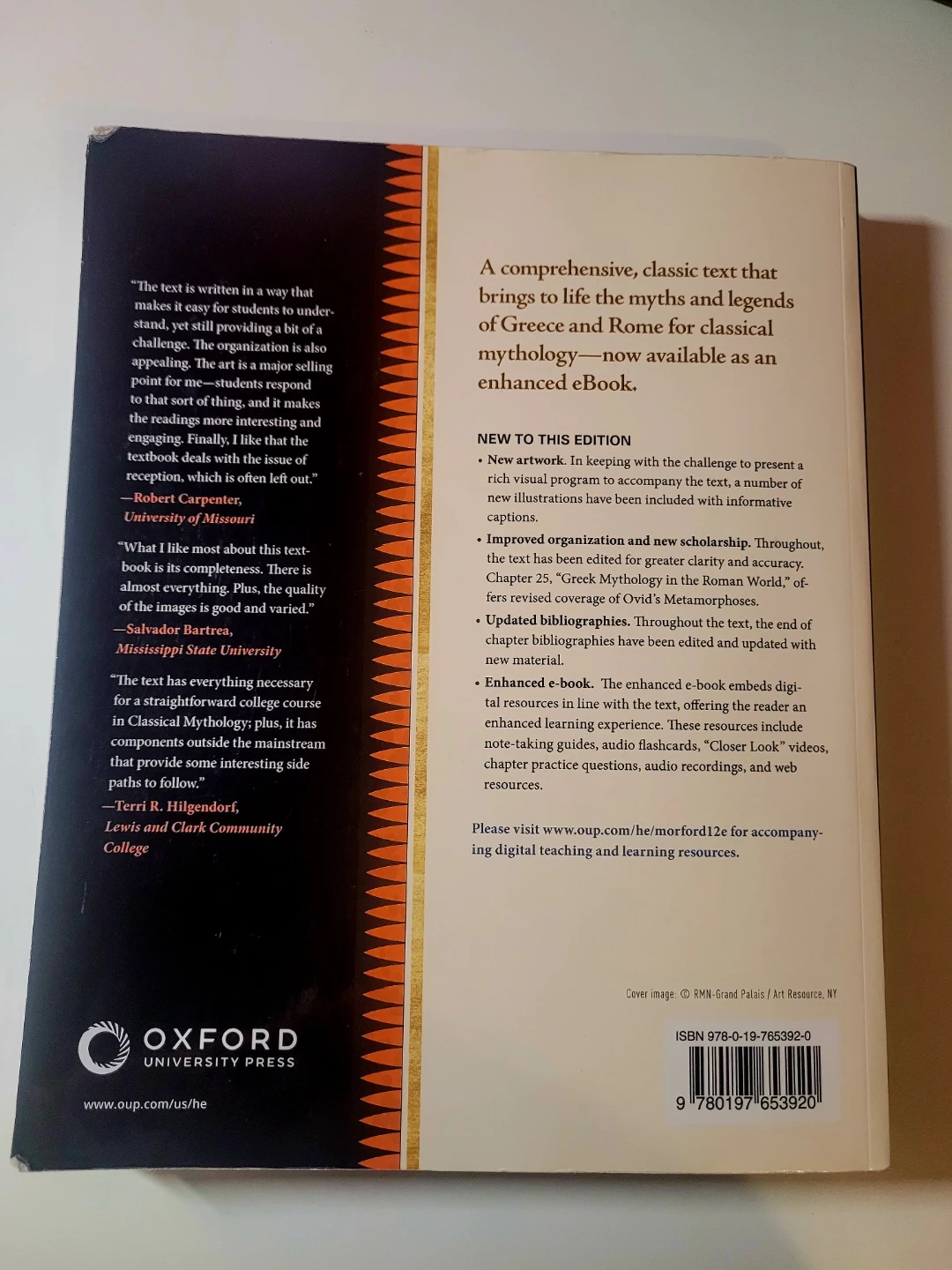 Selling a copy of Classical Mythology by Mark Morford, Robert J. Lenardon, and Michael Sham. It's the twelfth edition, published by Oxford University Press. This book is a comprehensive text that brings to life the myths and legends of Greece and Rome.