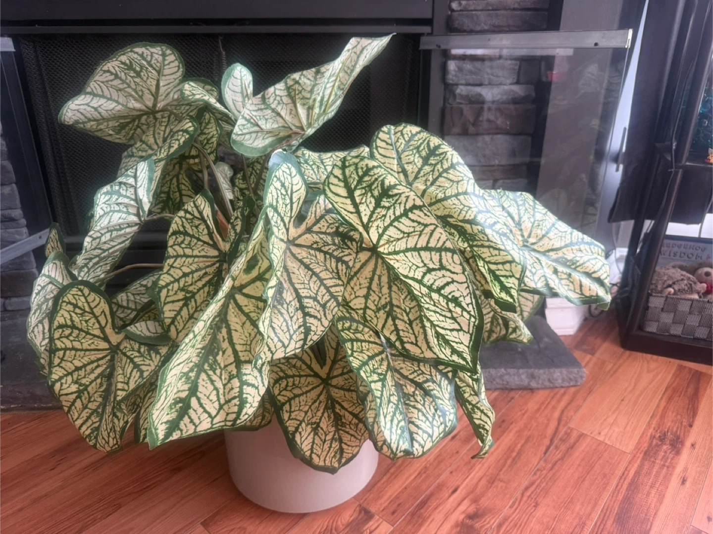 Here's a lovely caladium plant in a pot! It has beautiful white and green patterned leaves. It's perfect for adding a touch of nature to your home