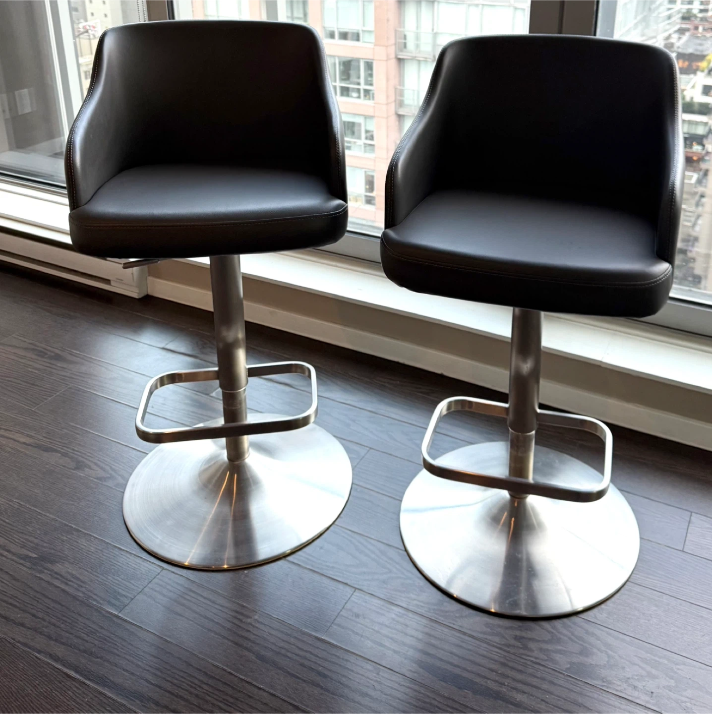 Selling a set of two modern bar stools. They feature a sleek design with black leather seats and a sturdy metal base. Perfect for adding a touch of elegance to your kitchen or bar area! They are in great condition and ready for a new home