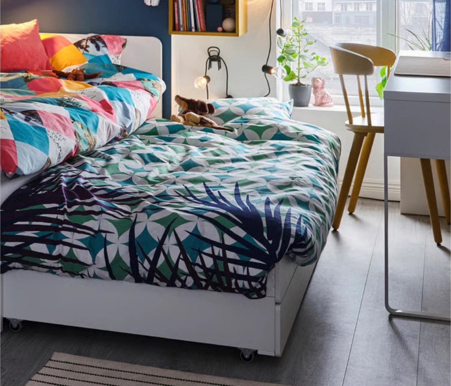 It's a twin-sized bed and comes with built-in storage drawers, perfect for a kid's room or guest room.