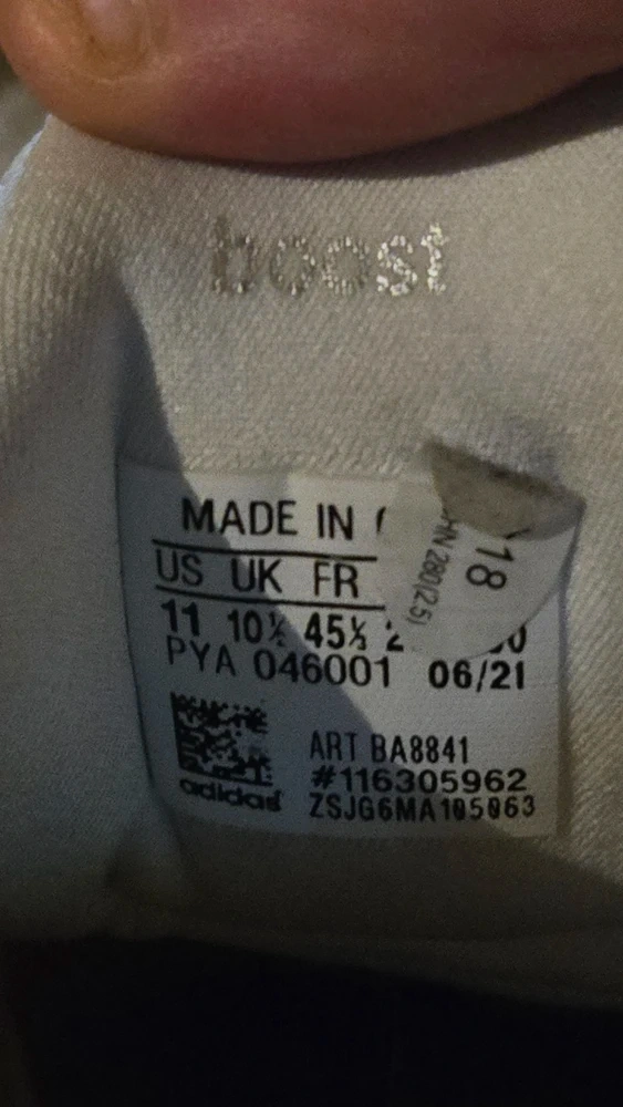 Selling a pair of Adidas Ultra Boost shoes in US size 11. They are in good condition and ready for a new owner! The manufacturing date is June 2021.