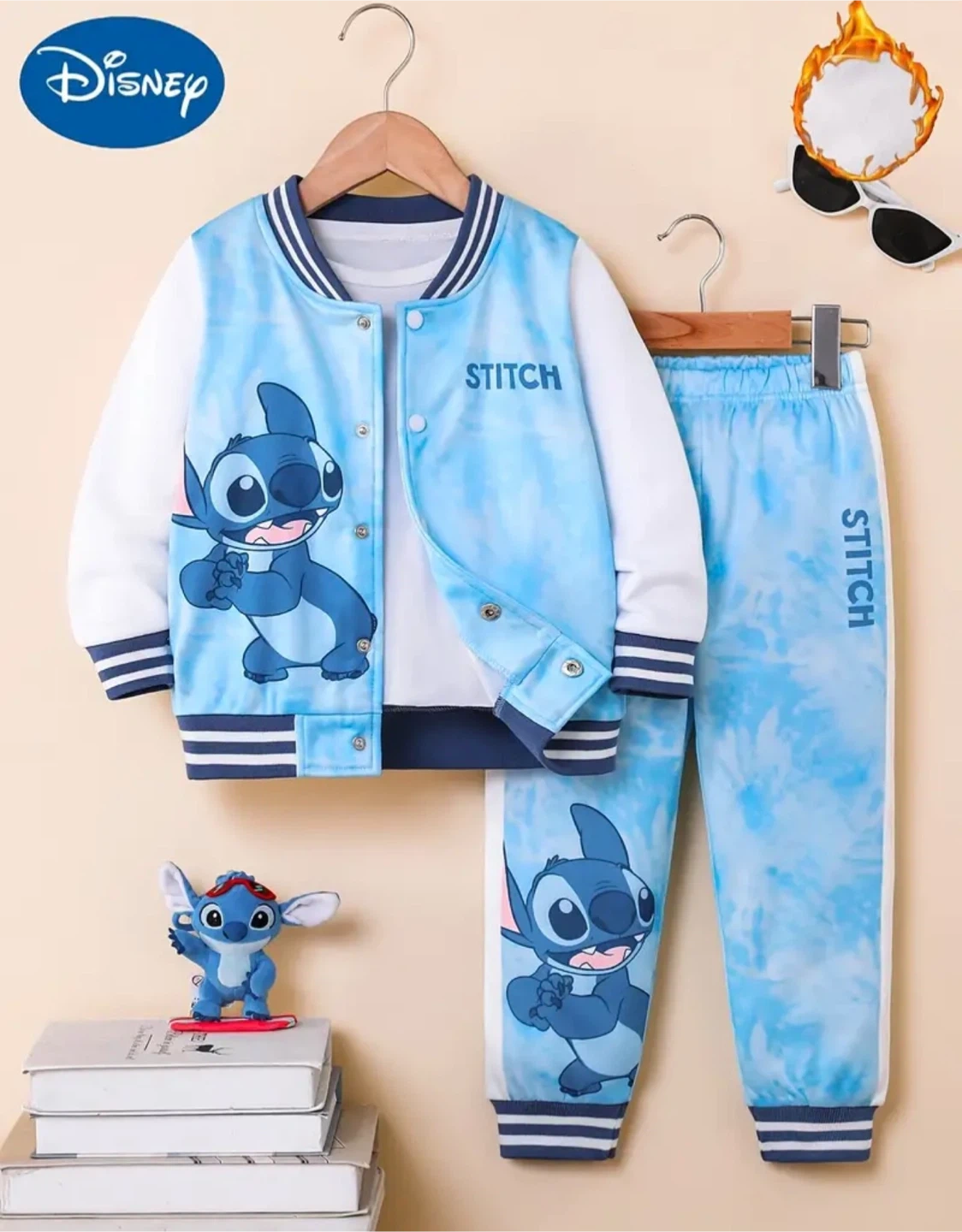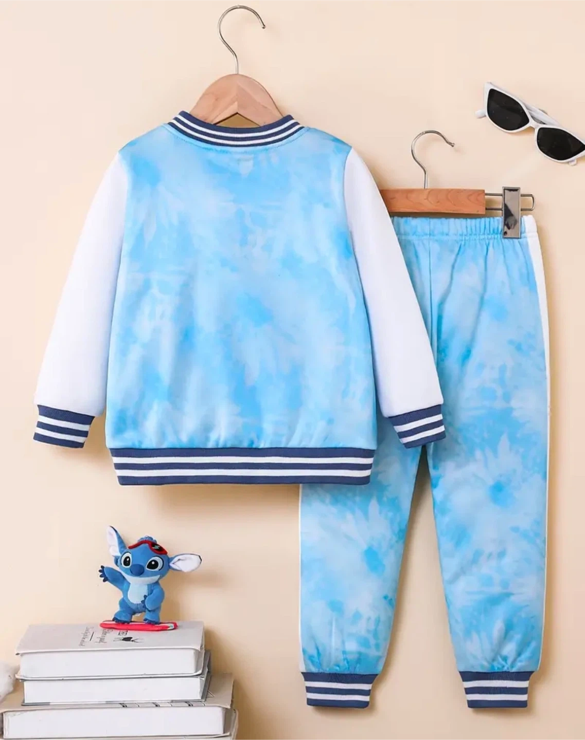 This adorable Disney Stitch tracksuit set is perfect for your little one! It features a cute Stitch design on a blue tie-dye background. The set includes a jacket and pants, making it a complete outfit for playtime or outings. Super cute and comfy!