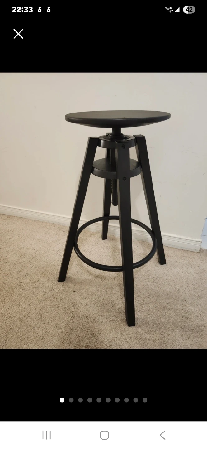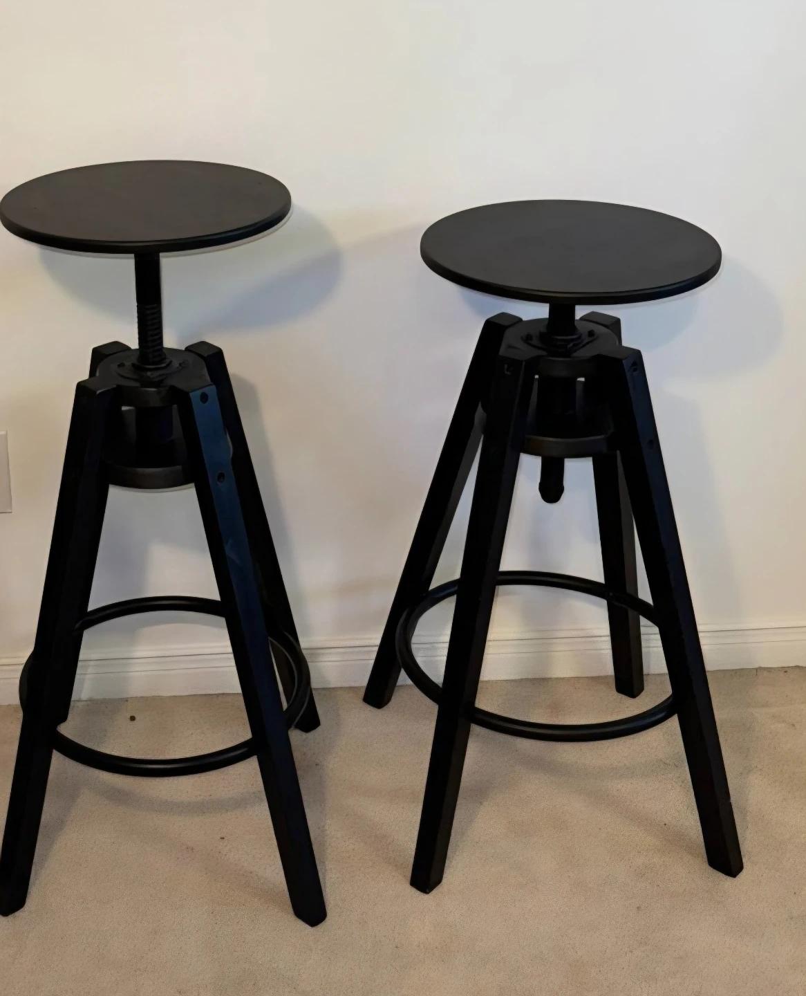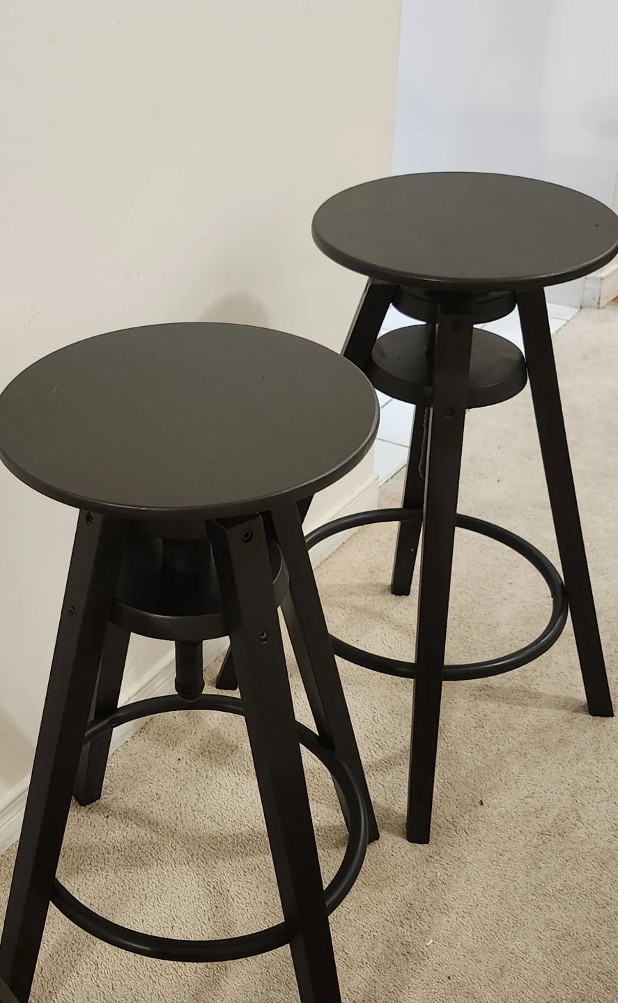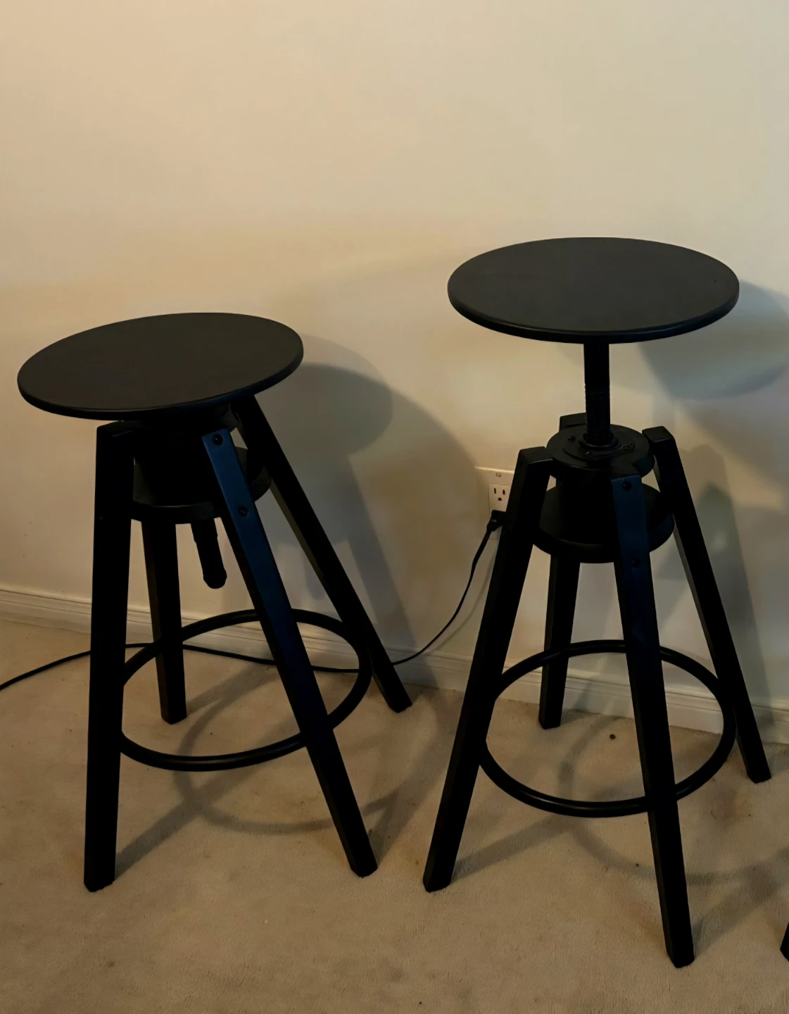 Selling a set of two bar stools in black! They feature an adjustable height mechanism, so you can customize them to fit your space. They're in New condition and would be perfect for a kitchen island or home bar. They have a simple, modern design and are quite sturdy! Height adjustable from 63 cm (24 3/4") to 74 cm (29 1/8")
