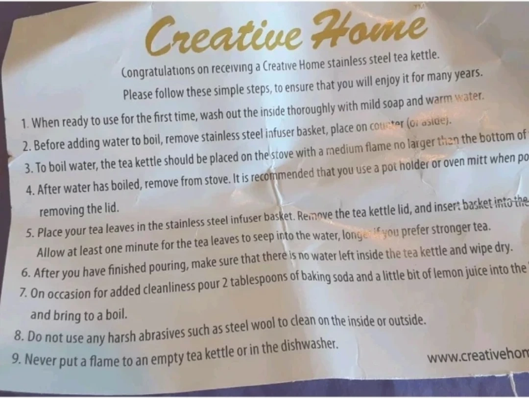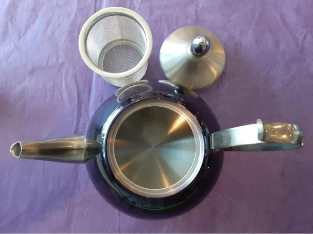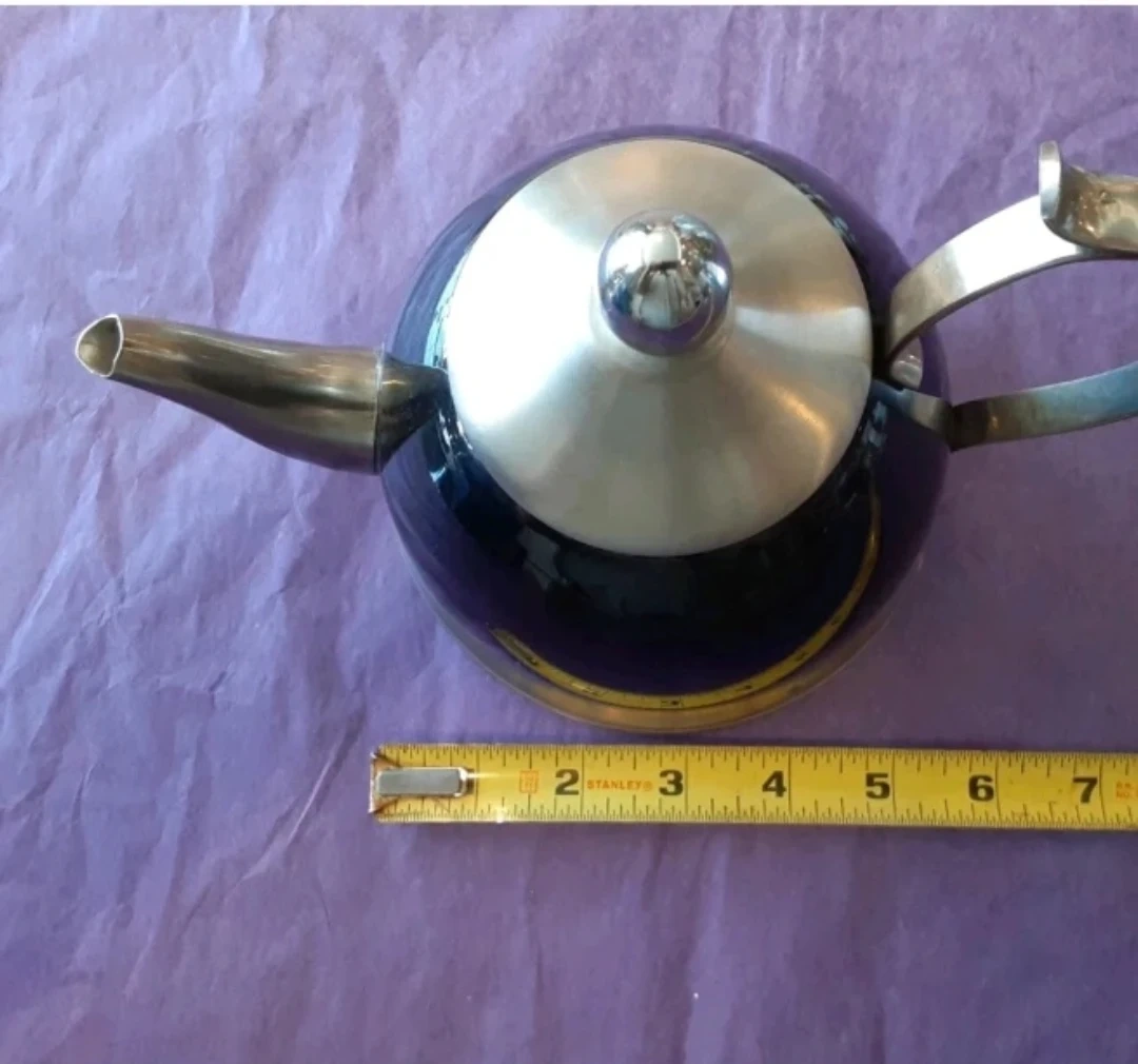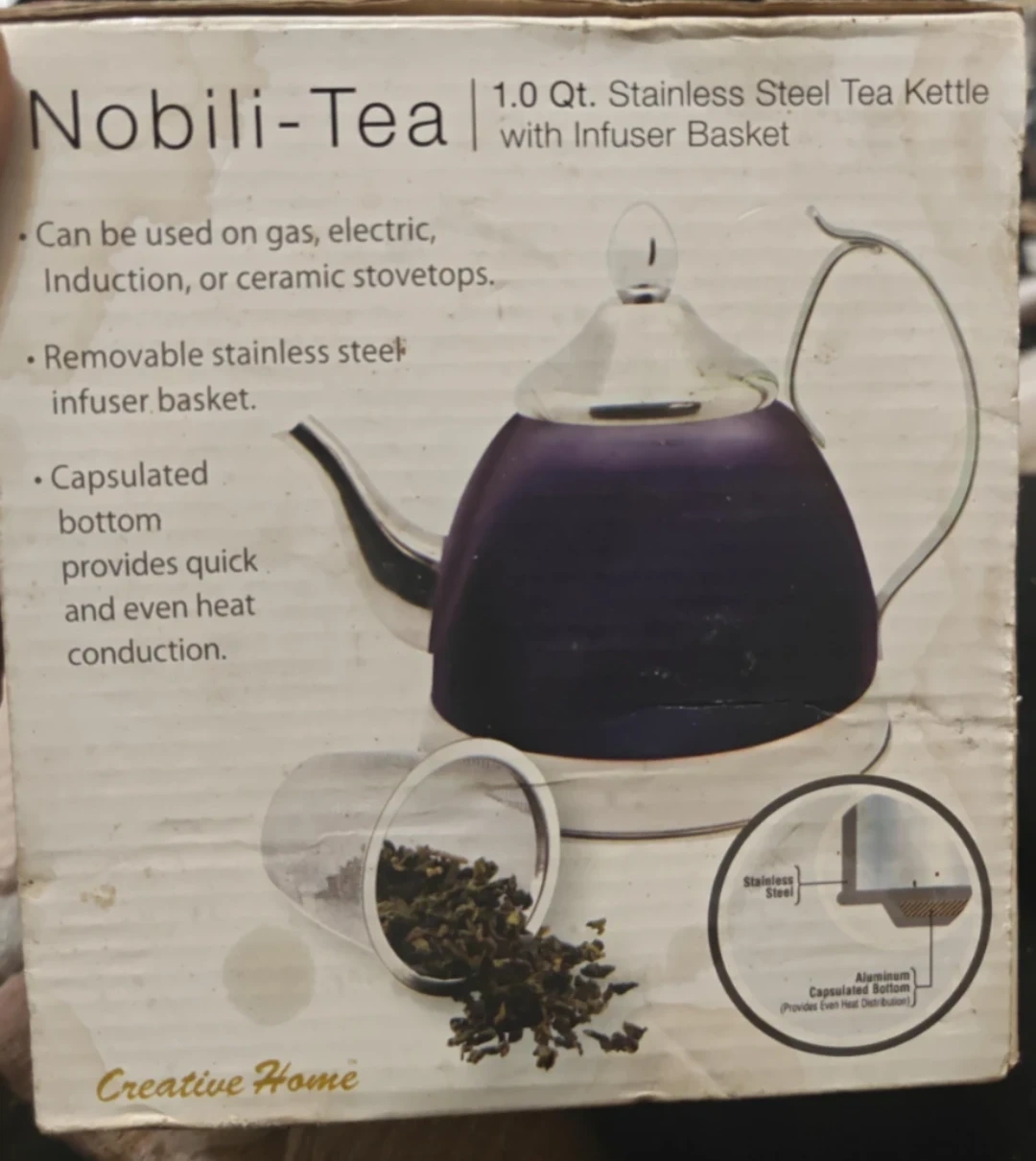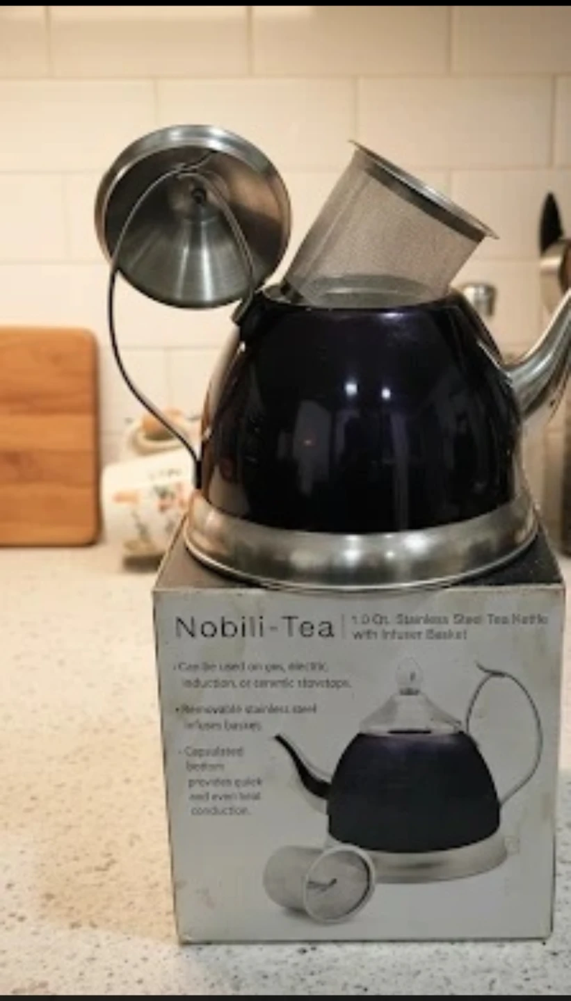 Selling a New, never used Nobili-Tea 1.0 Qt stainless steel purple tea kettle with infuser basket. It can be used on gas, electric, induction, or ceramic stovetops. The kettle features a removable stainless steel infuser basket and an encapsulated bottom that provides quick and even heat conduction. Comes with the box. box has storage damage, kettle in excellent unused condition.