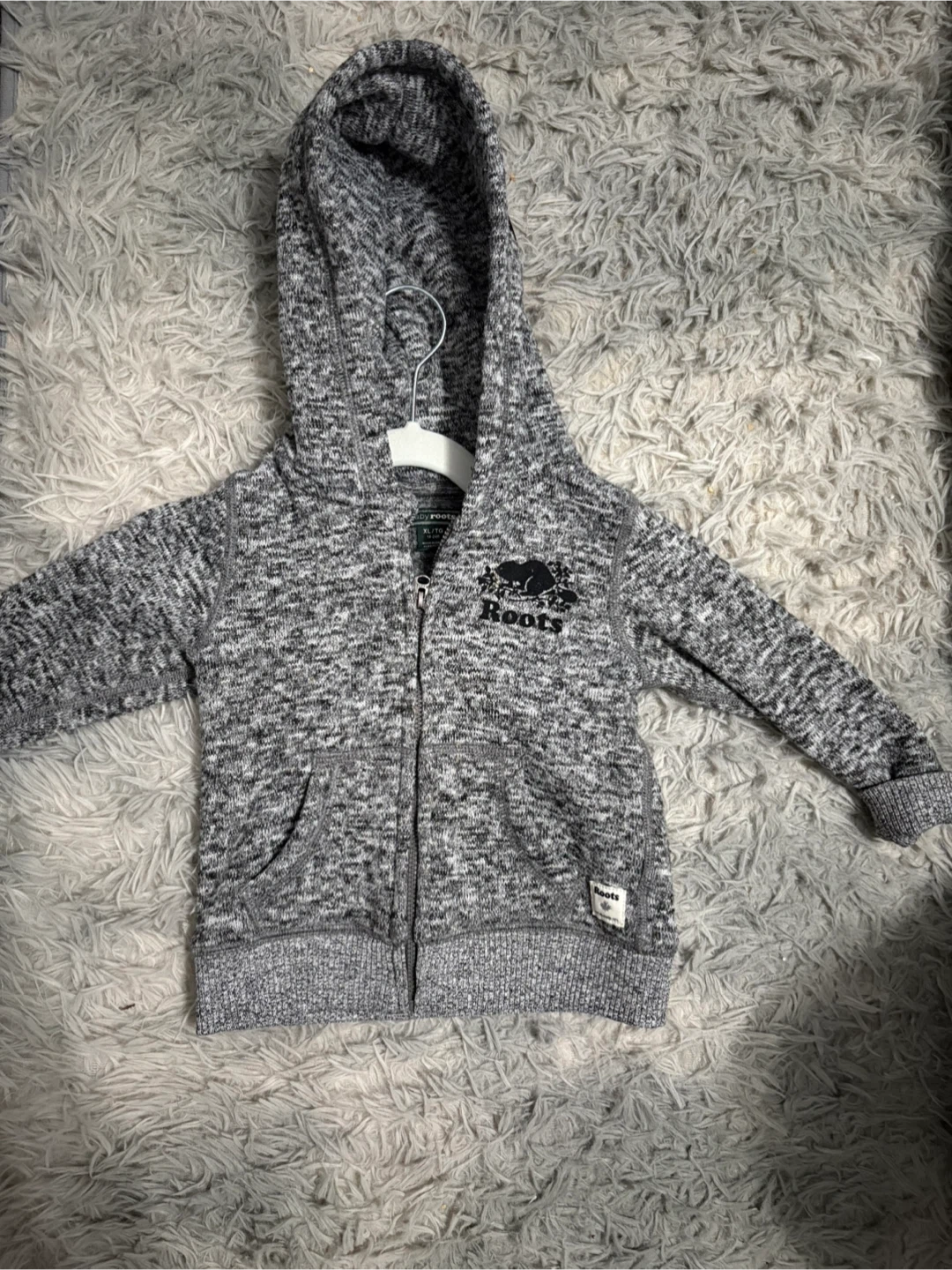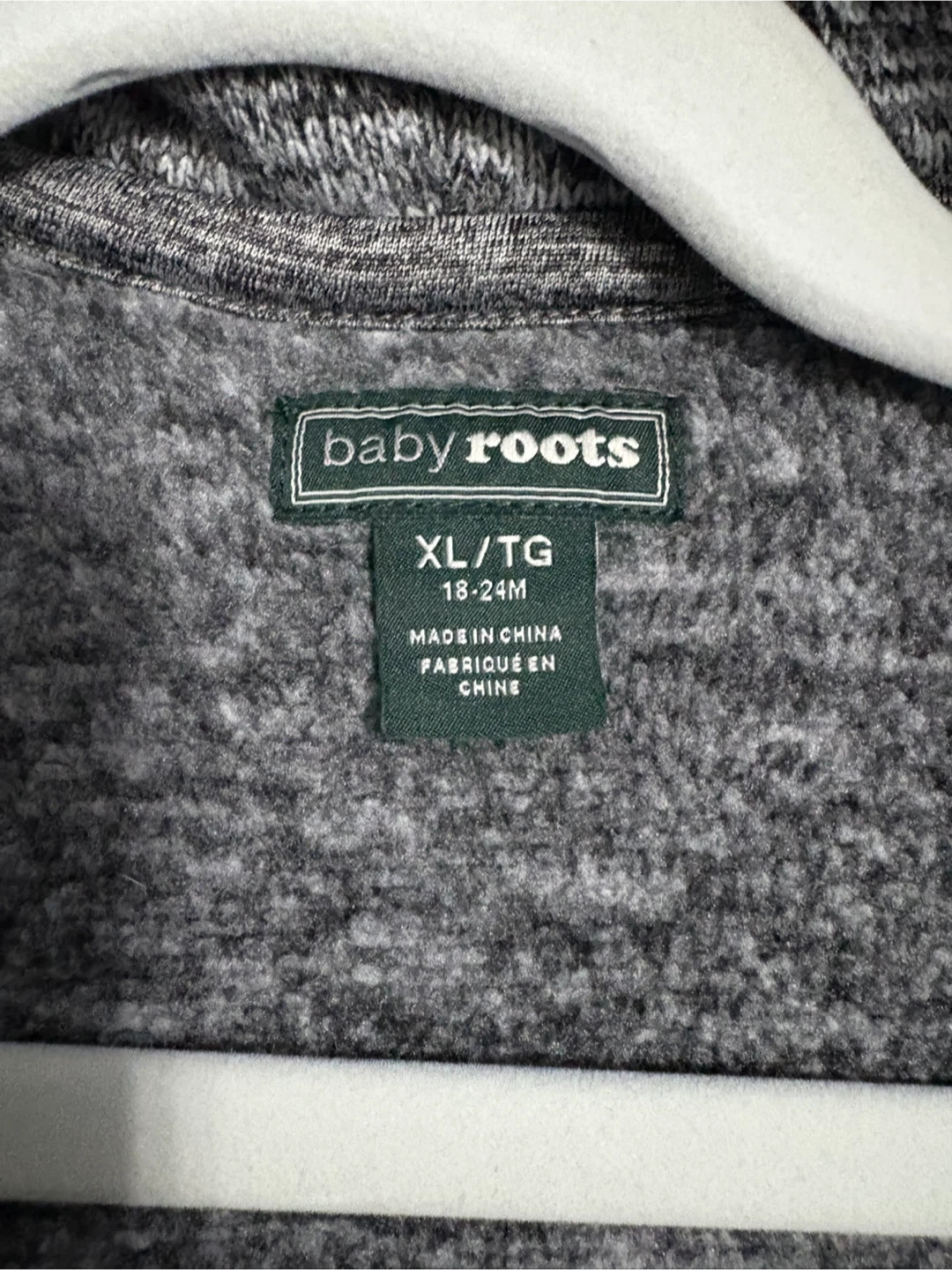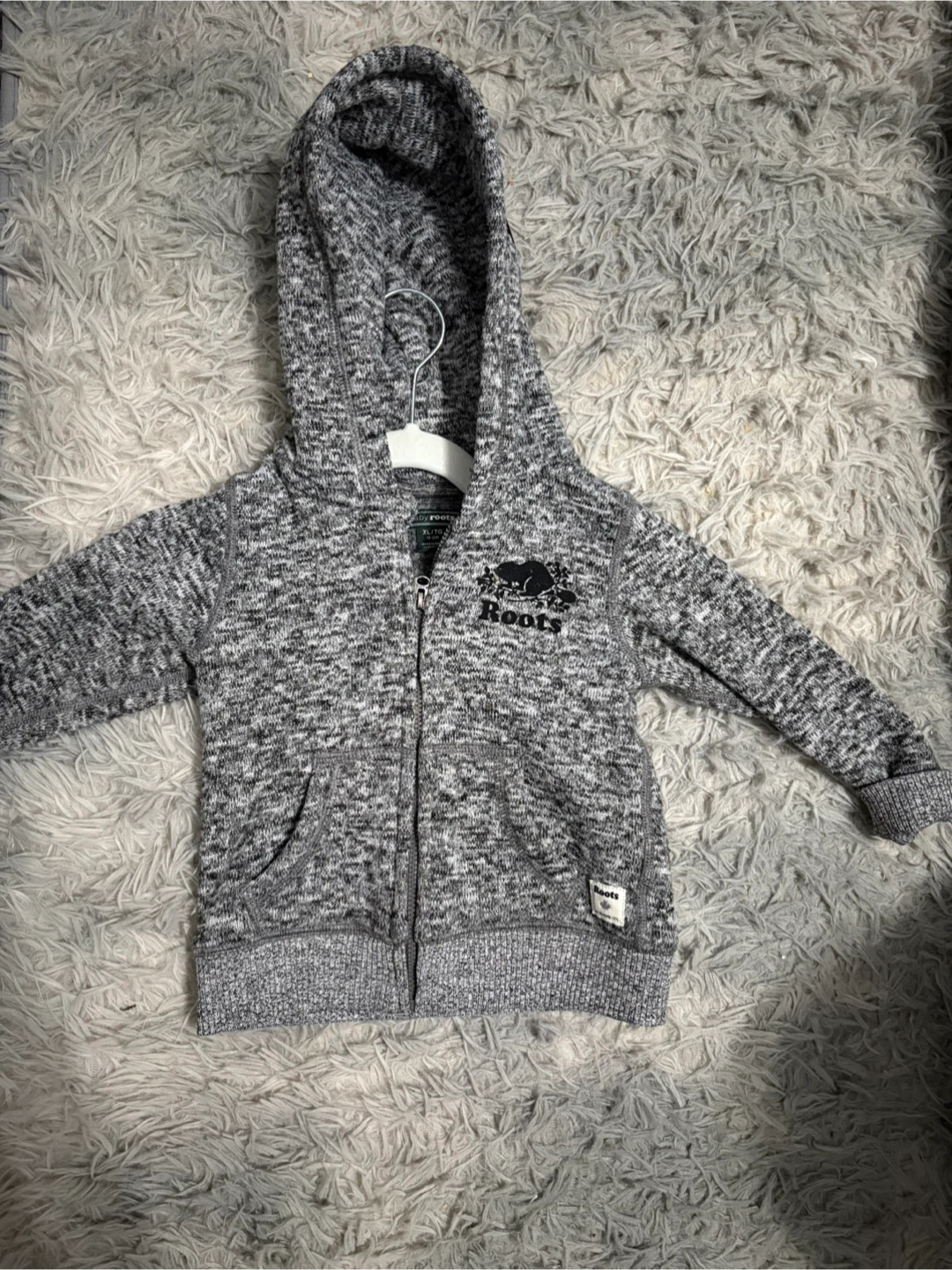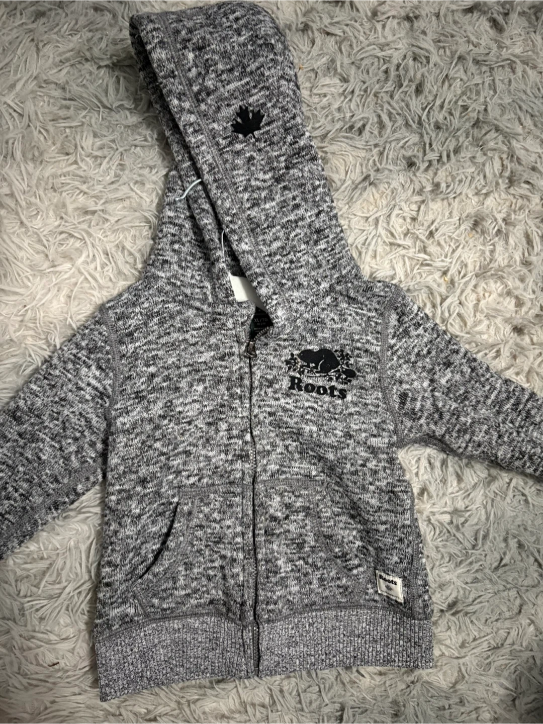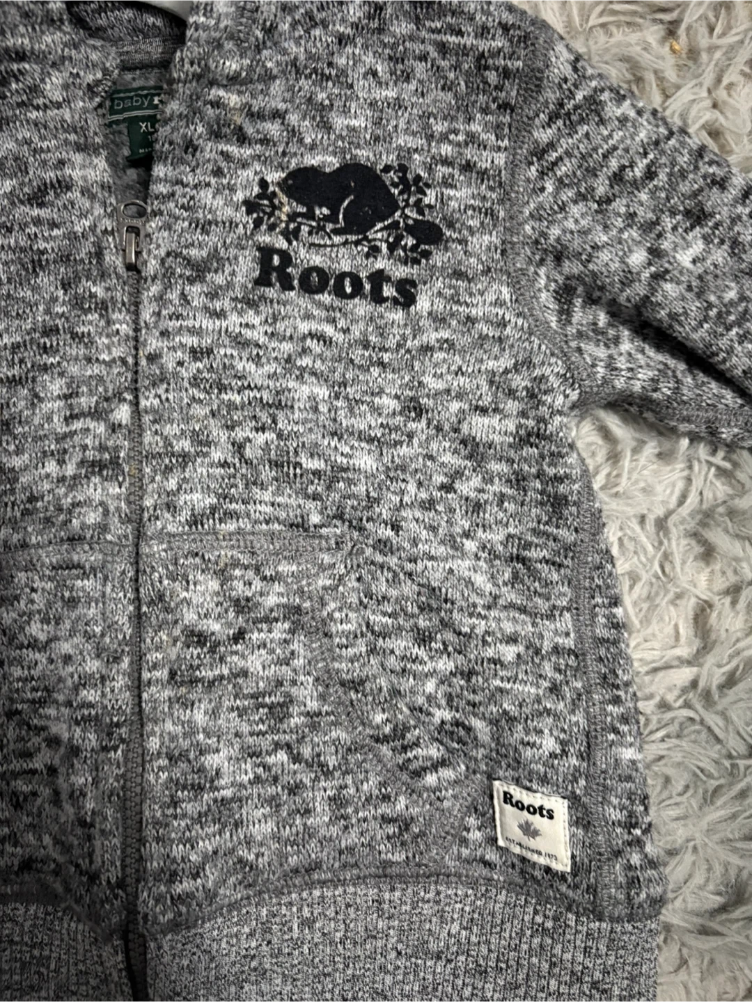 Here's a cozy Baby Roots zip-up hoodie in size XL, which fits 18-24 month olds! It's a lovely grey colour with the classic Roots logo. Perfect for keeping your little one warm and stylish. In brand new condition worn once.