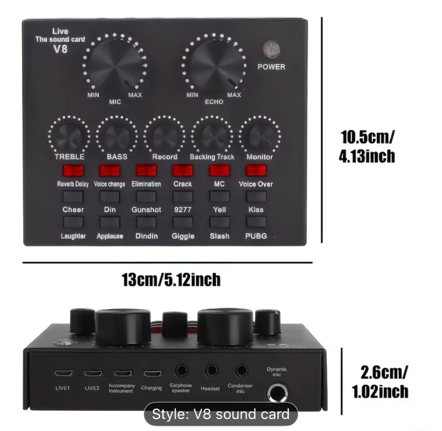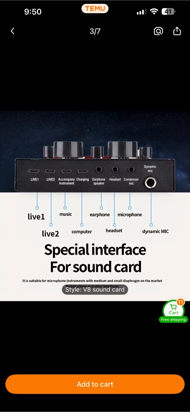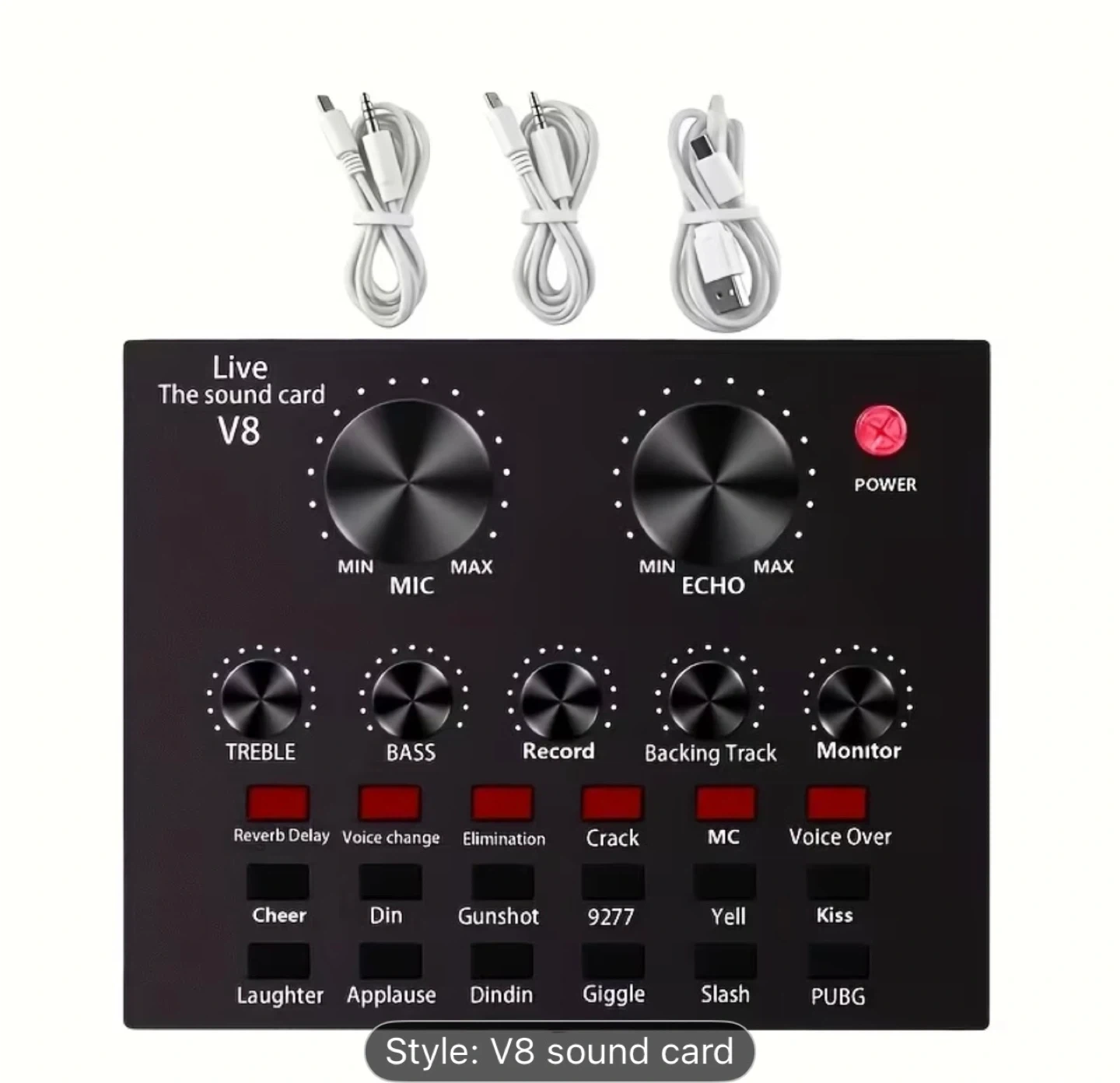 Selling a V8 live sound card! It's perfect for recording and changing your voice. It has a variety of sound effects like reverb, delay, and voice change. It also includes cables for connecting to your devices