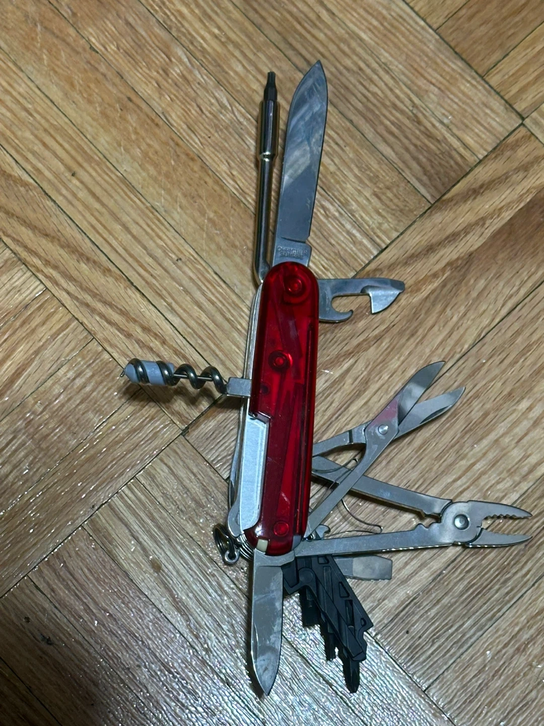 Selling a Victorinox Cybertool 34 Swiss Army Knife in translucent red. It's a versatile tool with many functions. Originally bought for $199.62. Great for anyone who needs a variety of tools in a compact package