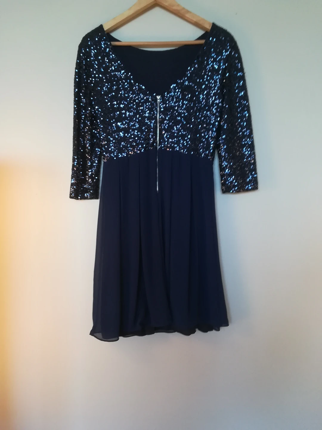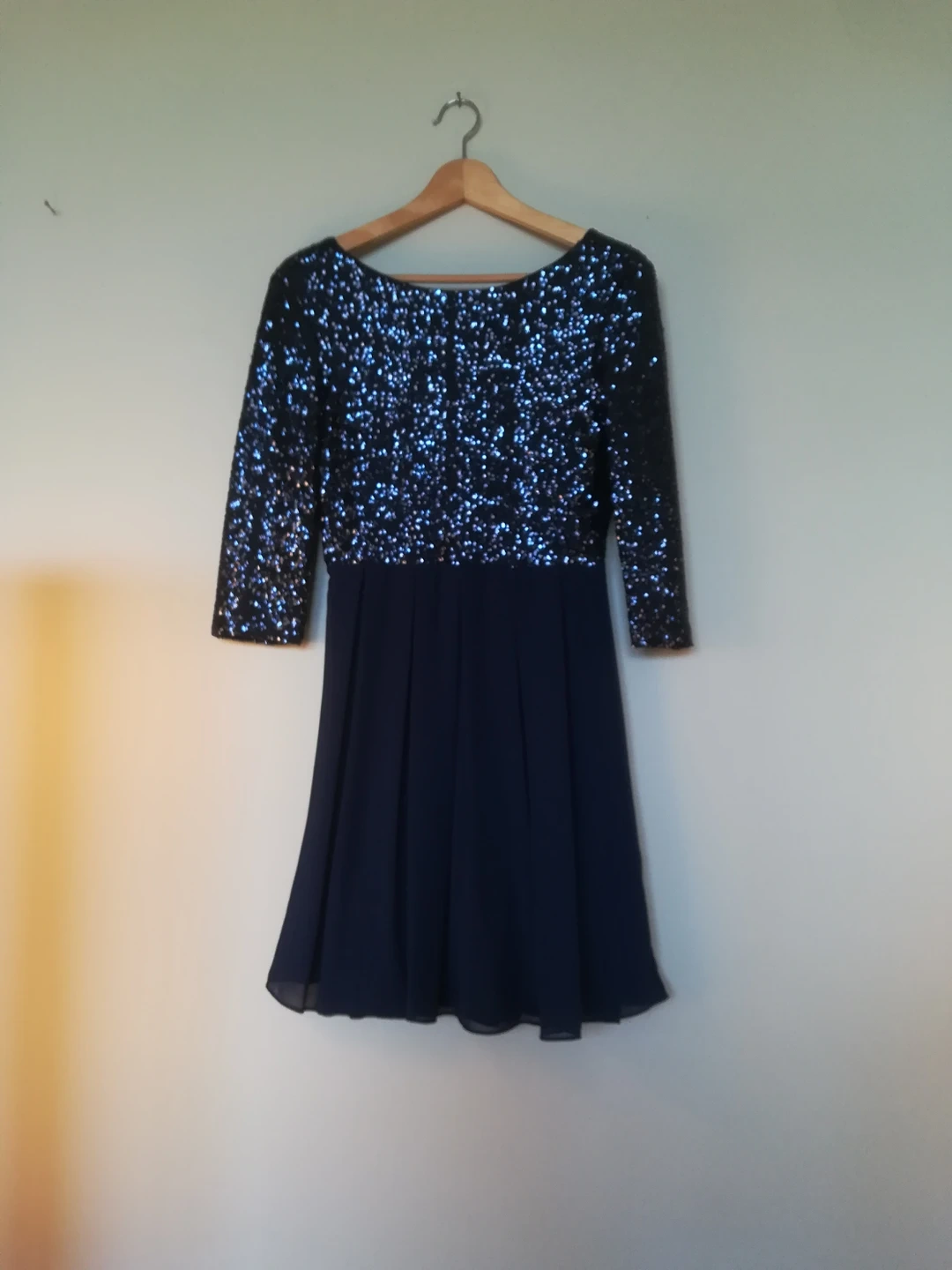 Purchased in a boutique in Ottawa for a Christmas party. Only worn once. It's lining is soft so very comfortable to wear. Features a stunning sequined blue top.