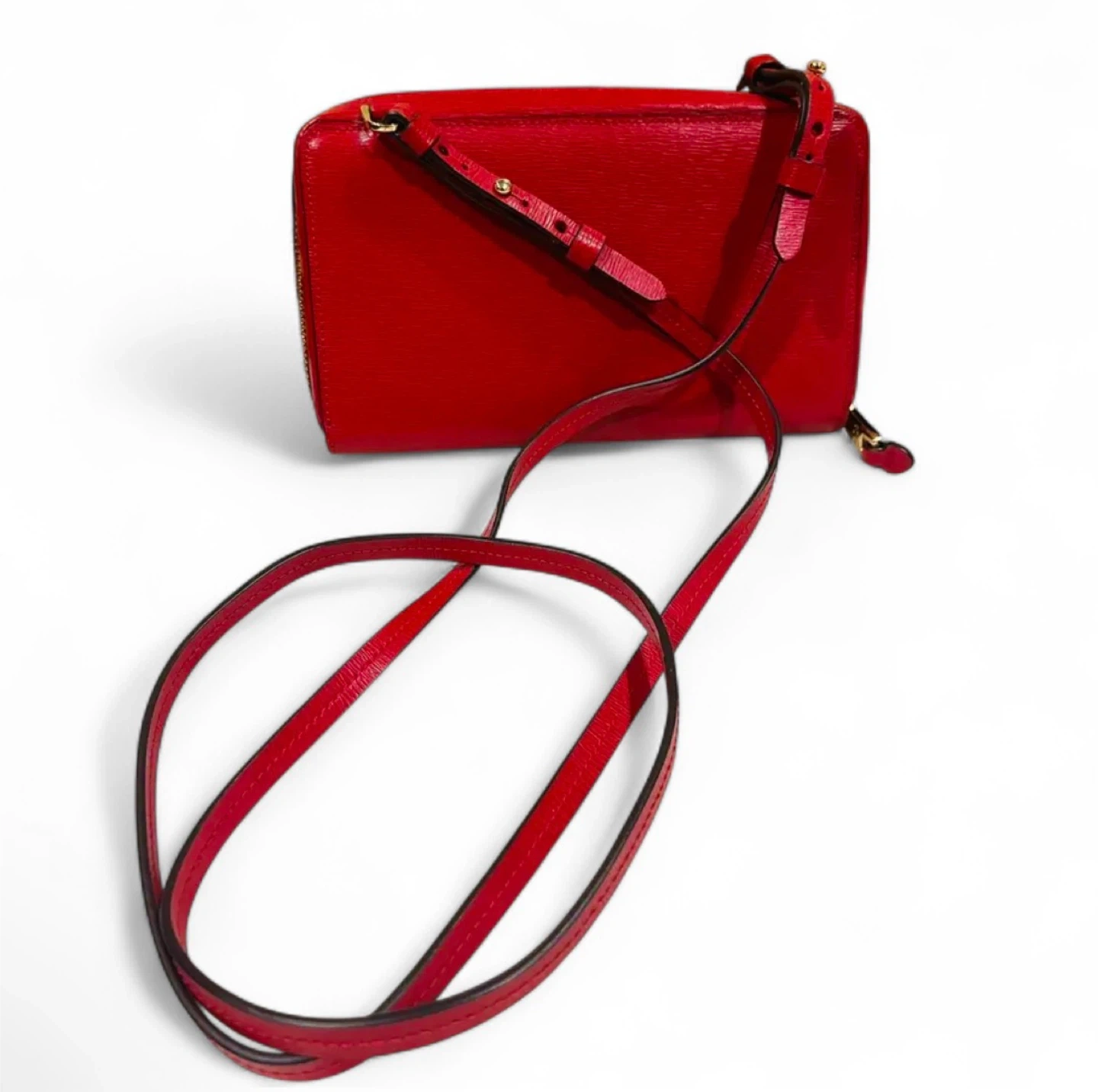 Used just a few times. Excellent condition. Beautiful compact bag. Crossbody with adjustable straps. Gorgeous red with gold hardware. No flaws to note. Lightweight.