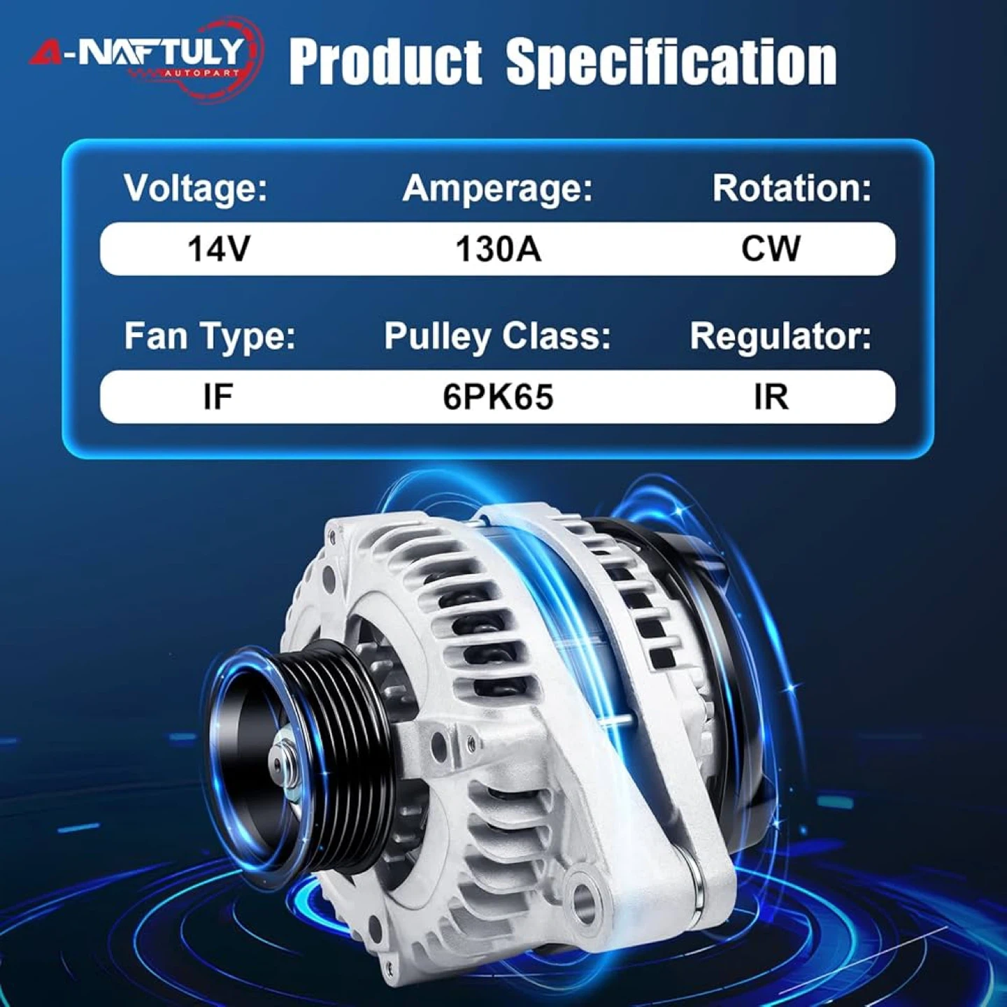 It features 14V voltage and 130A amperage with CW rotation. Fan type is IF, Pulley Class is 6PK65, and Regulator is IR. Comes with the box