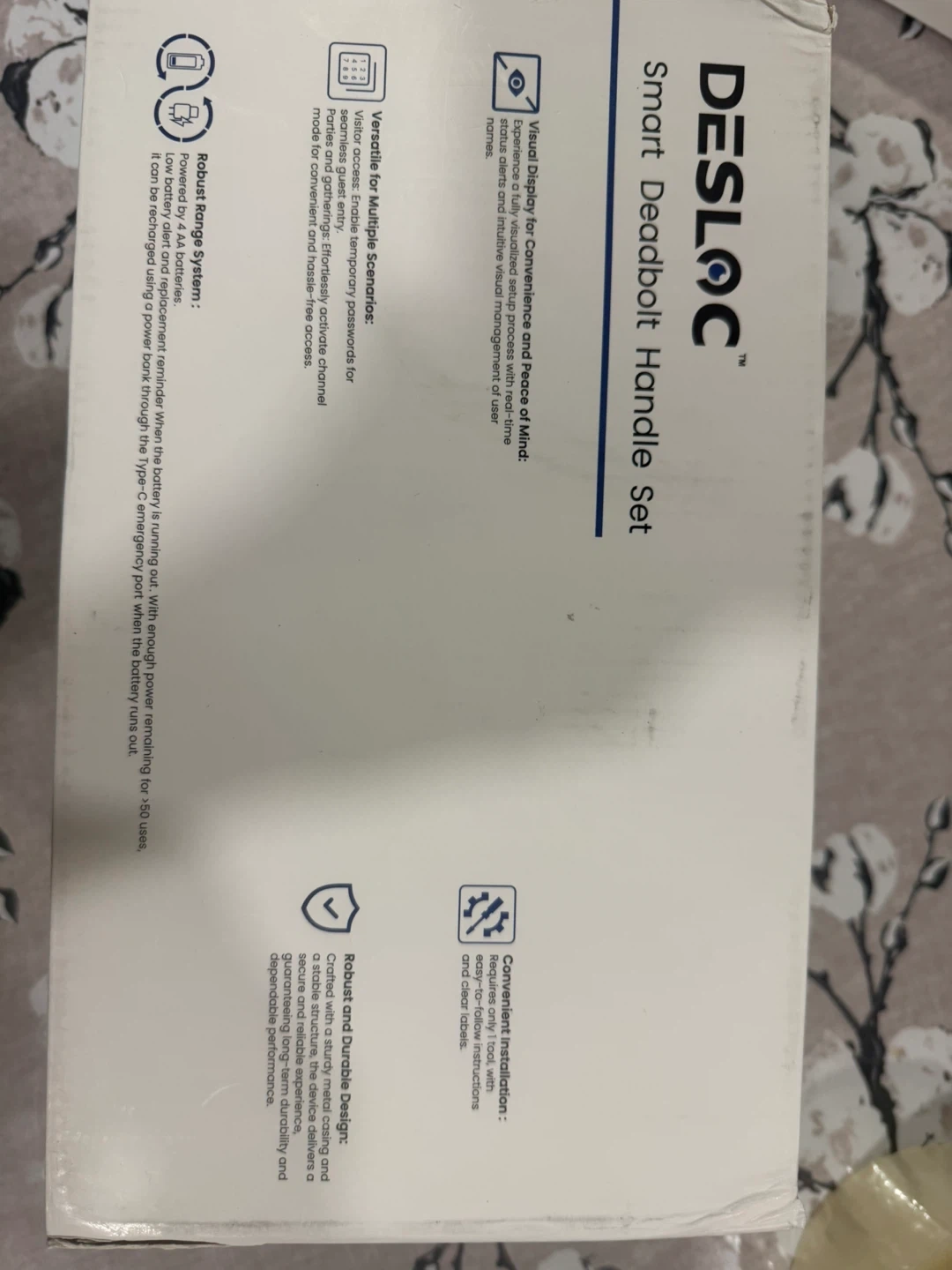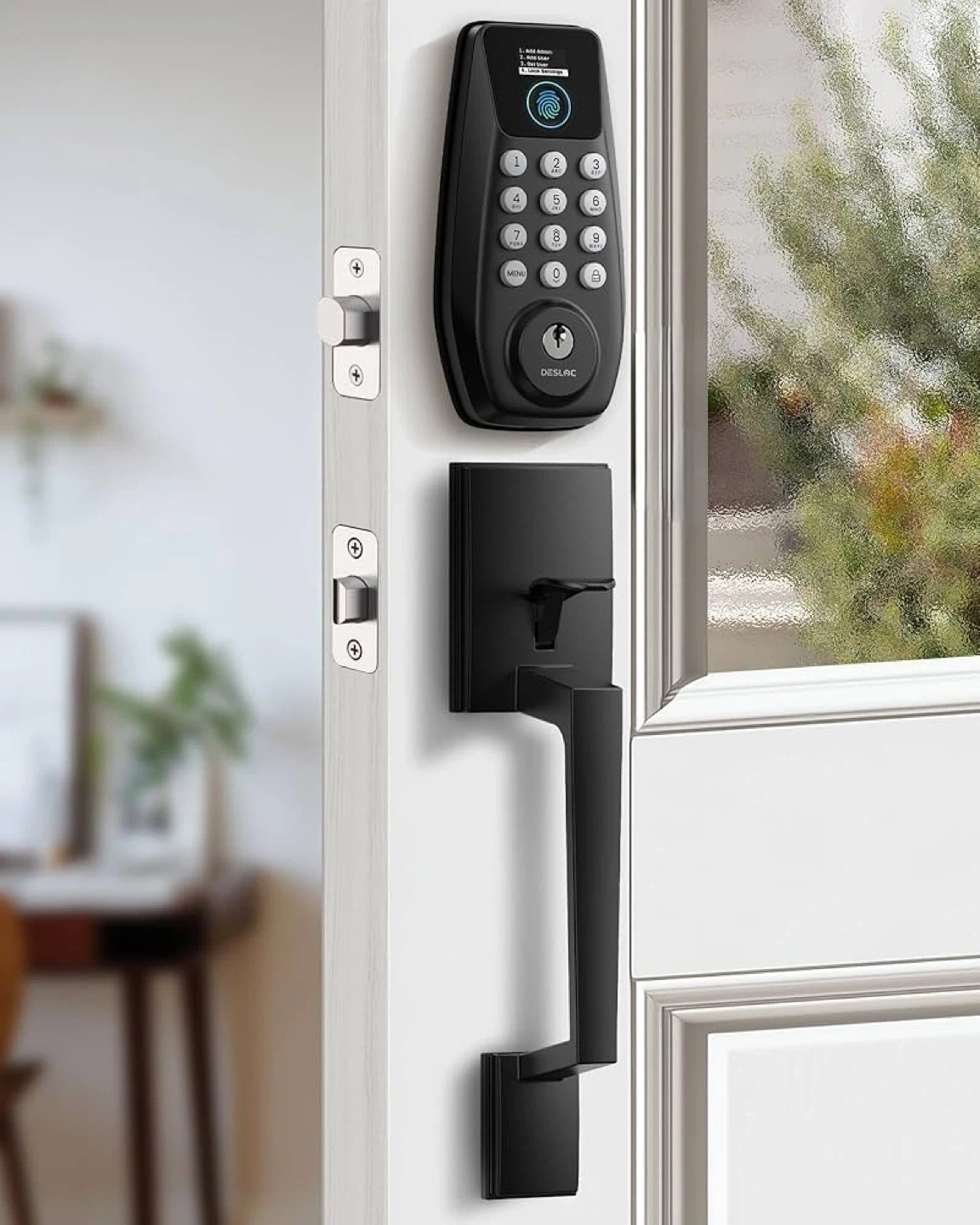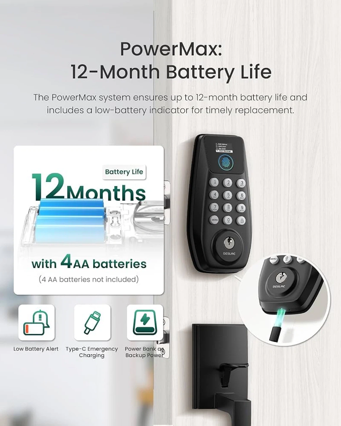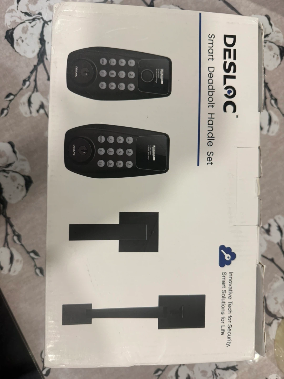 Selling a brand new DESLOC Smart Deadbolt Handle Set in black. This smart lock offers convenience and peace of mind with real-time status alerts and intuitive setup processes. It's designed for easy one-tool installation and includes clear tables for guidance. The PowerMax system ensures up to 12-month battery life, with a low-battery indicator for timely replacement. It's powered by 4 AA batteries and can be recharged using a power bank through the Type-C charger if the battery runs out. The box is included!
