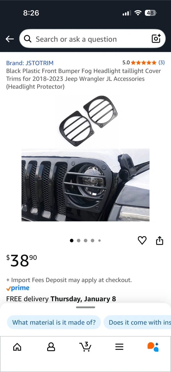 Selling a black plastic front bumper fog headlight taillight cover trim by JSTOTRIM for 2018-2023 Jeep Wrangler JL accessories (headlight protector). Originally bought for $38.90