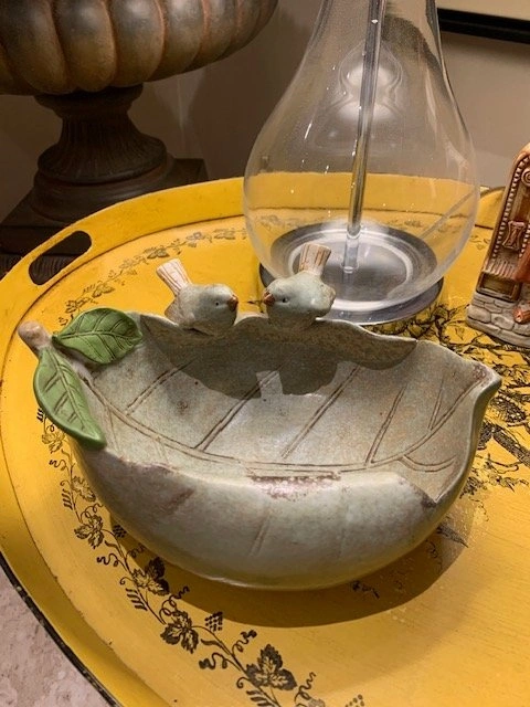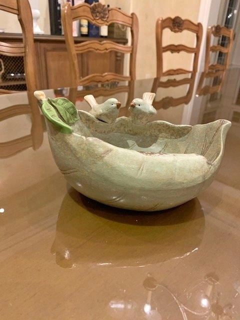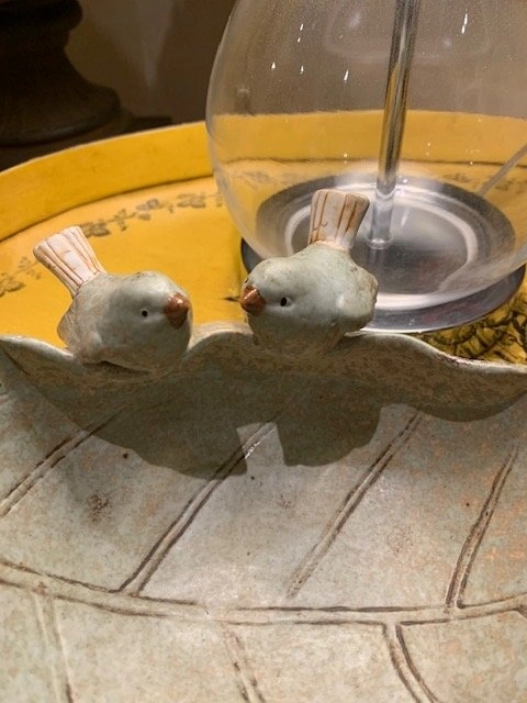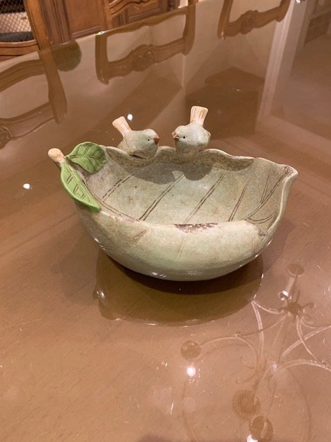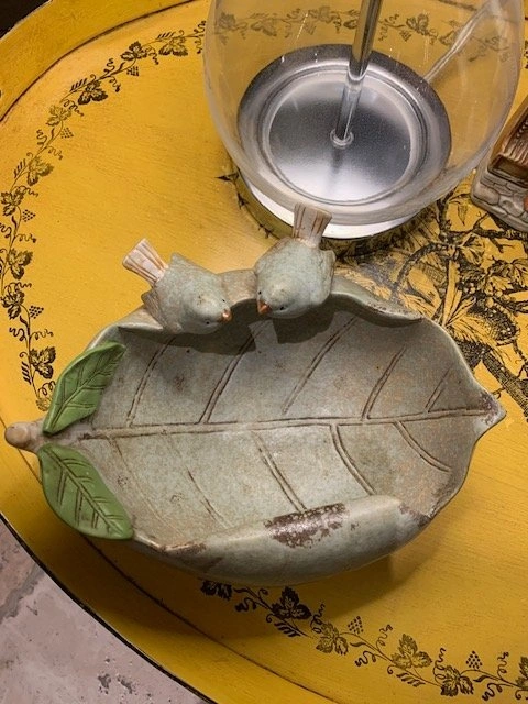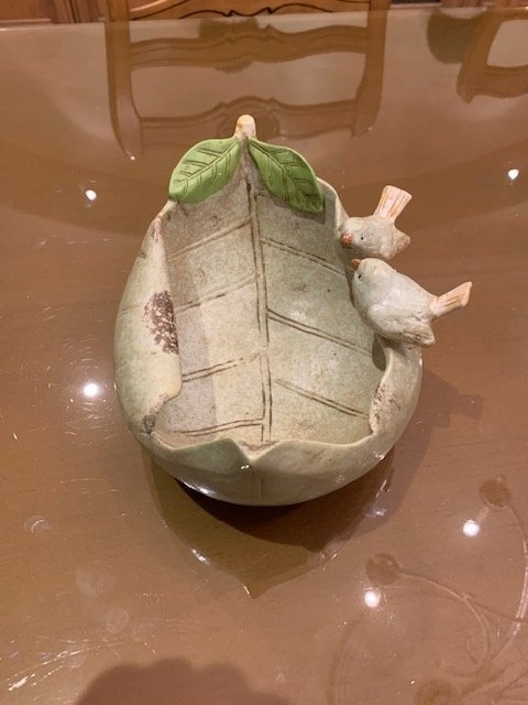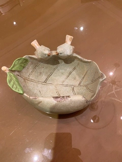 Two Birds Sitting on the edge of a leaf shaped bowl