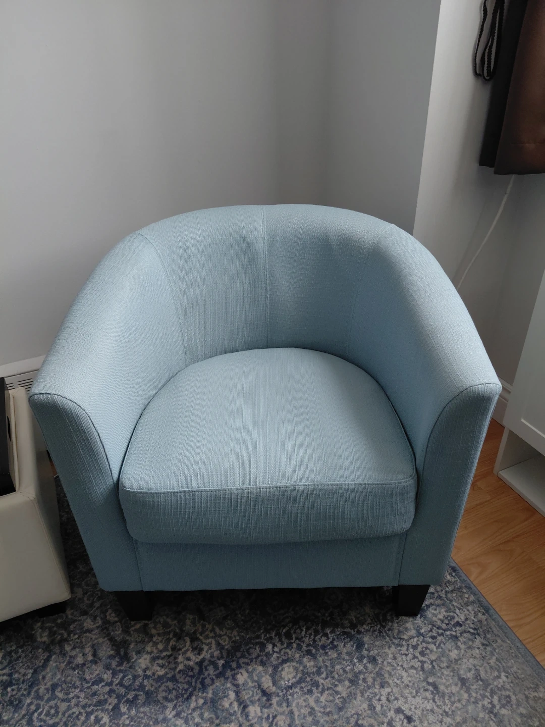Here's a comfy light blue green bucket armchair! It's in great condition and ready to add a pop of colour to your space. CASH ONLY. NO DELIVERIES.